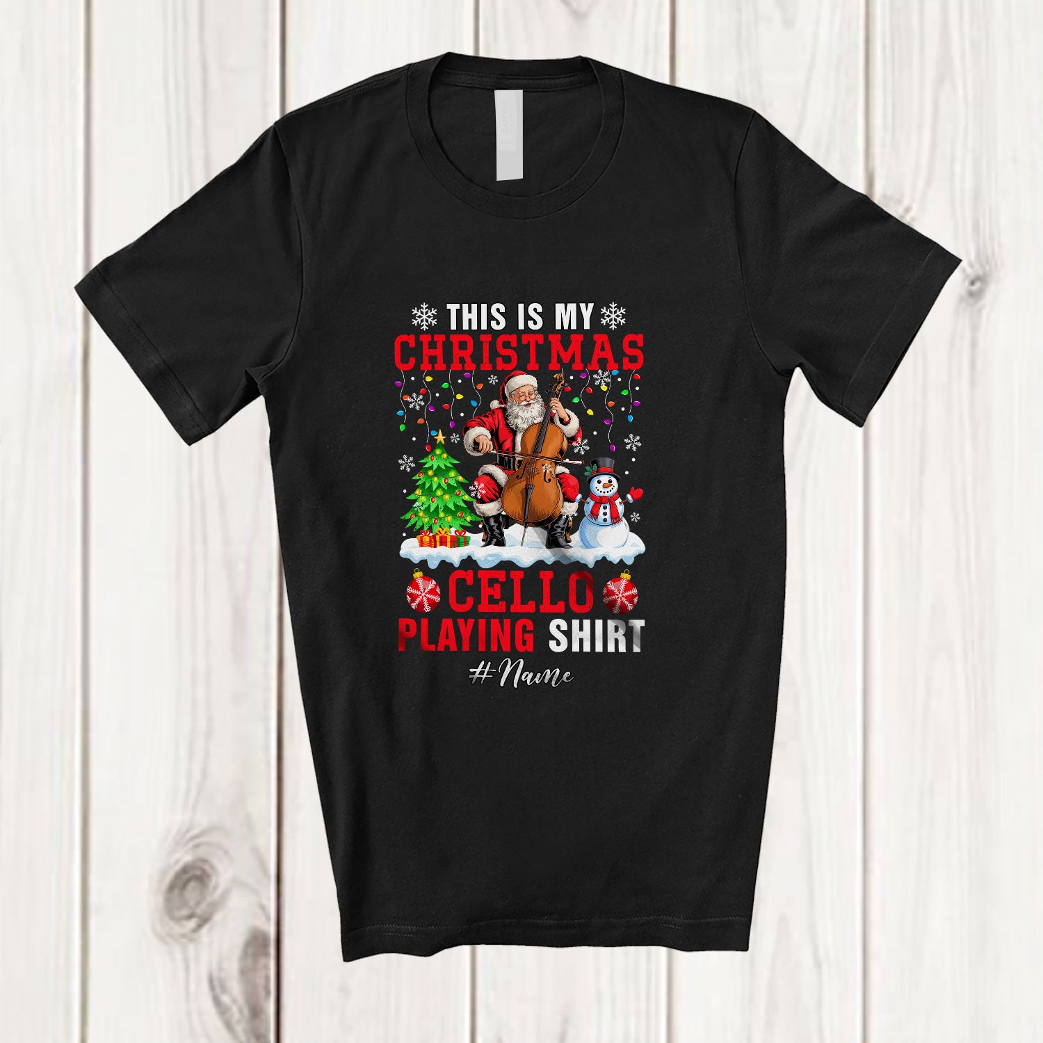 • Personalized Custom Name My Christmas Cello Playing Shirt; Joyful Santa Musical Instruments T-Shirt. This cotton t-shirt is a durable staple product with a classic fit. One of the most popular items, it has a relaxed style made for everyday and casual wear.