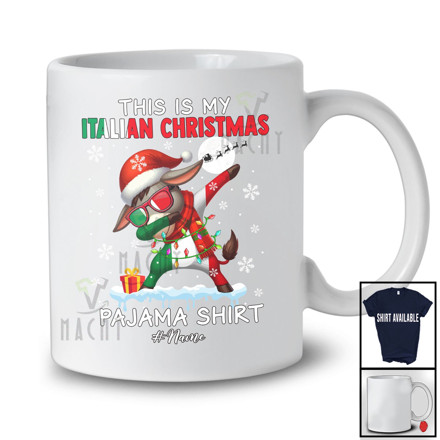 Personalized Custom Name My Italian Christmas Pajama Shirt; Cheerful Dabbing Donkey; Family T-Shirt. This cotton t-shirt is a durable staple product with a classic fit. One of the most popular items, it has a relaxed style made for everyday and casual wear.