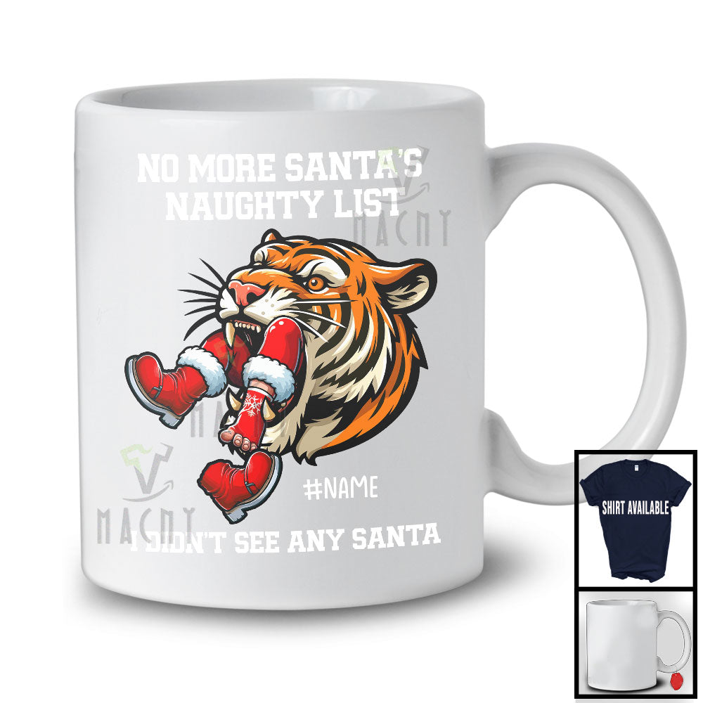 • Personalized Custom Name No More Santa's Naughty List; Sarcastic Christmas Tiger Eating Santa T-Shirt. This cotton t-shirt is a durable staple product with a classic fit. One of the most popular items, it has a relaxed style made for everyday and casual wear.