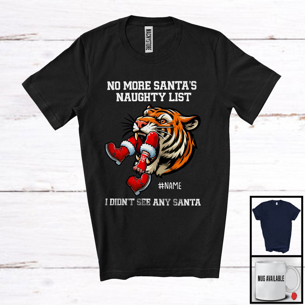 Personalized Custom Name No More Santa's Naughty List; Sarcastic Christmas Tiger Eating Santa T-Shirt