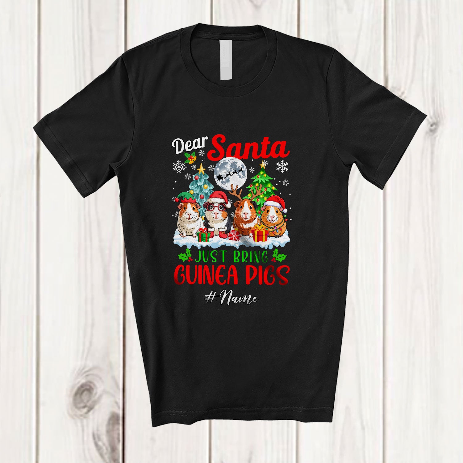 Personalized Custom Name Santa Just Bring Guinea Pigs; Joyful Christmas Moon Trees Four Animals T-Shirt. This cotton t-shirt is a durable staple product with a classic fit. One of the most popular items, it has a relaxed style made for everyday and casual wear.