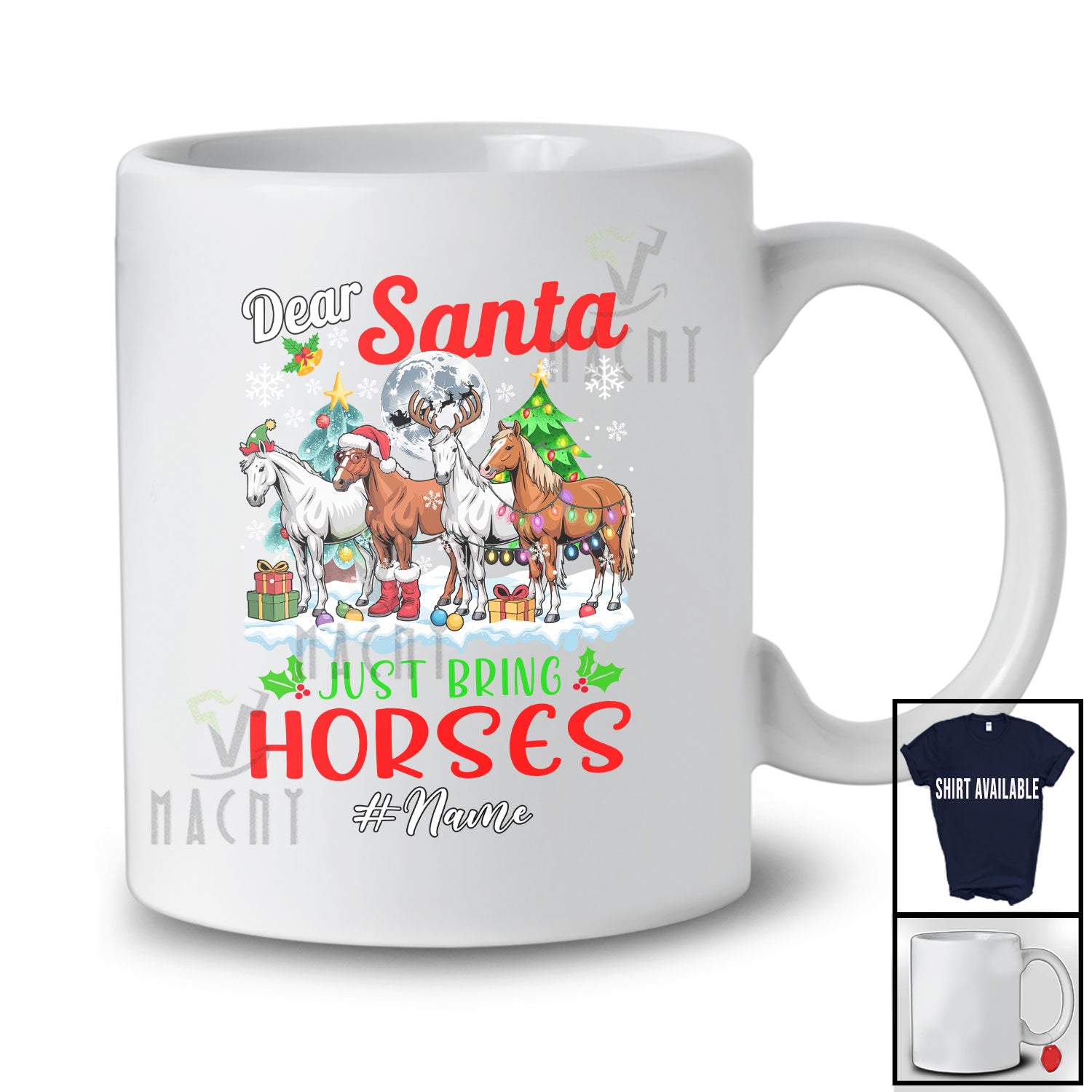 Personalized Custom Name Santa Just Bring Horses; Joyful Christmas Moon Trees Four Animals T-Shirt. This cotton t-shirt is a durable staple product with a classic fit. One of the most popular items, it has a relaxed style made for everyday and casual wear.
