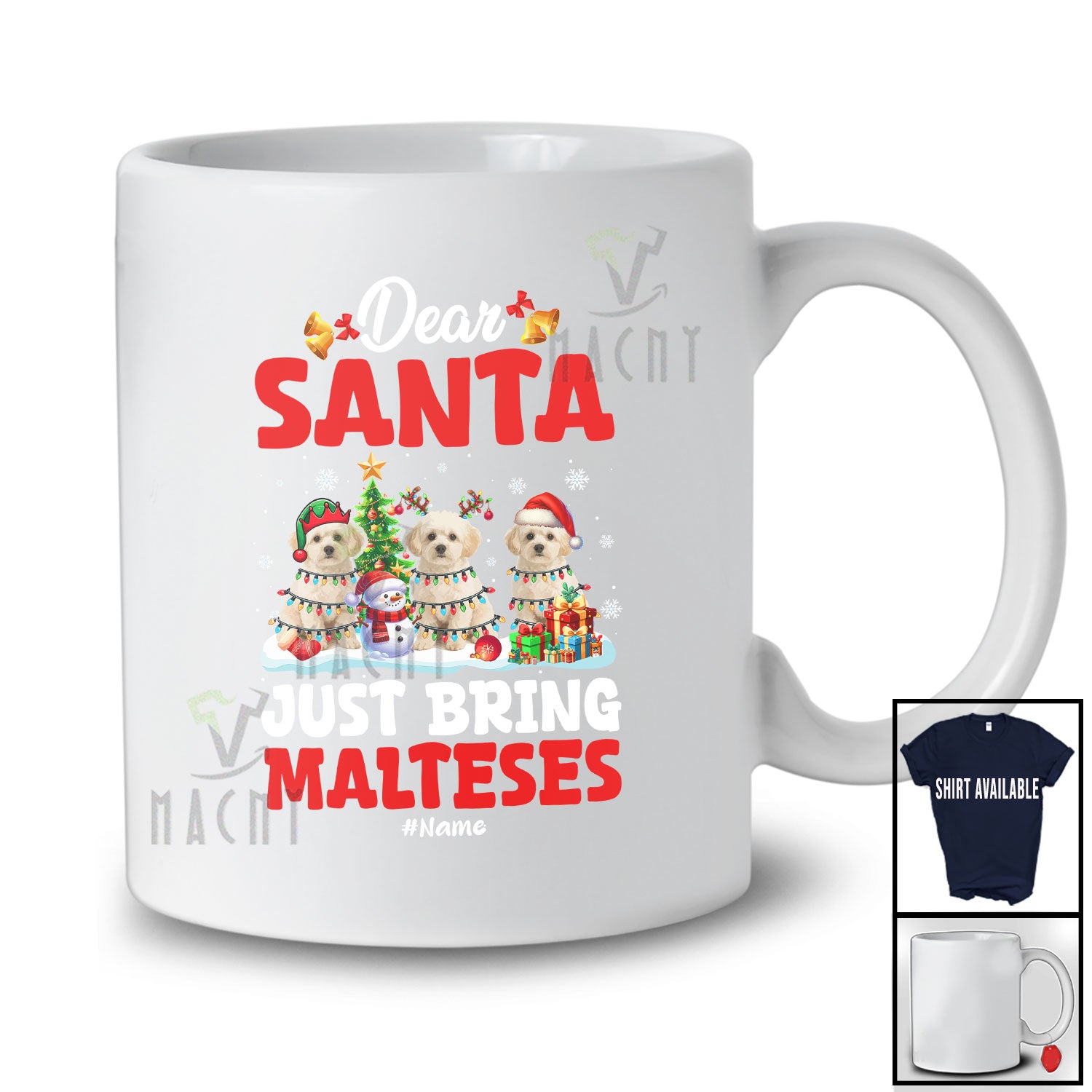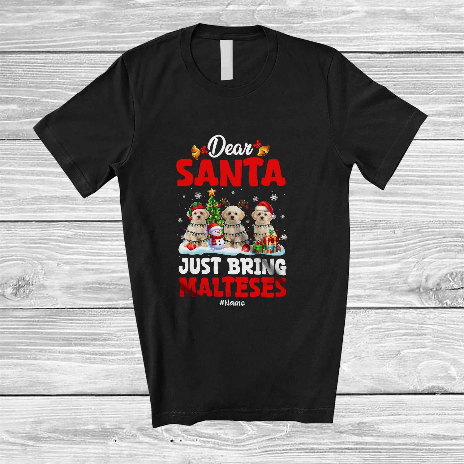 • Personalized Custom Name Santa Just Bring Maltipooes; Lovely Christmas Lights Tree Family T-Shirt. This cotton t-shirt is a durable staple product with a classic fit. One of the most popular items, it has a relaxed style made for everyday and casual wear.