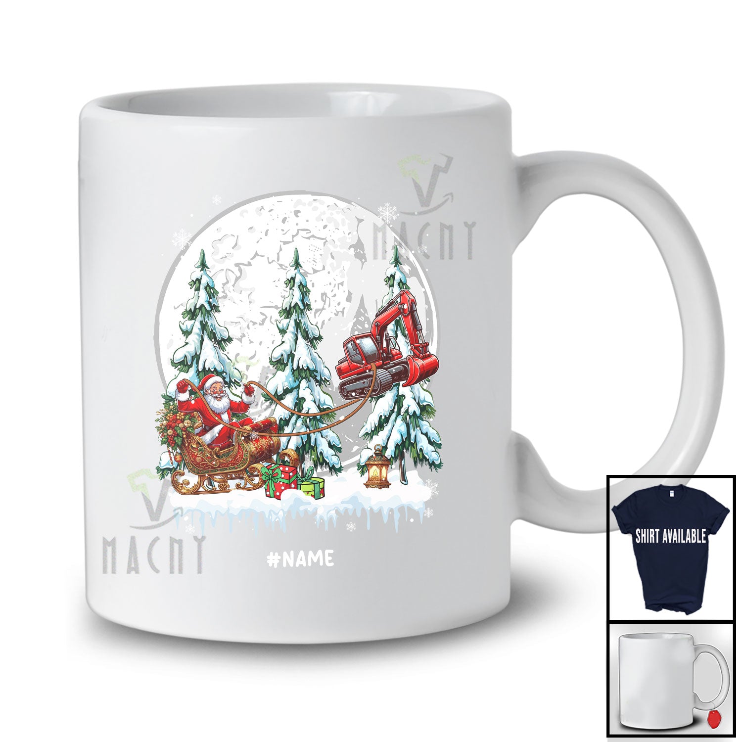 Personalized Custom Name Santa Sledding Excavator Sleigh; Joyful Christmas Tree Moon Driver T-Shirt. This cotton t-shirt is a durable staple product with a classic fit. One of the most popular items, it has a relaxed style made for everyday and casual wear.