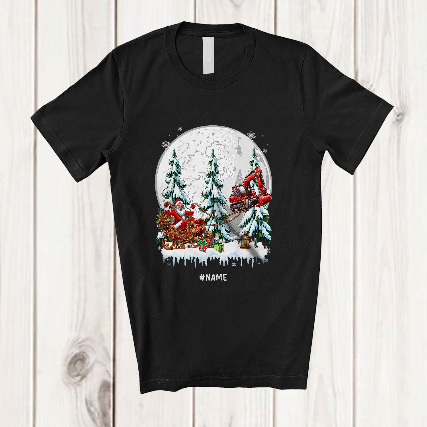 Personalized Custom Name Santa Sledding Excavator Sleigh; Joyful Christmas Tree Moon Driver T-Shirt