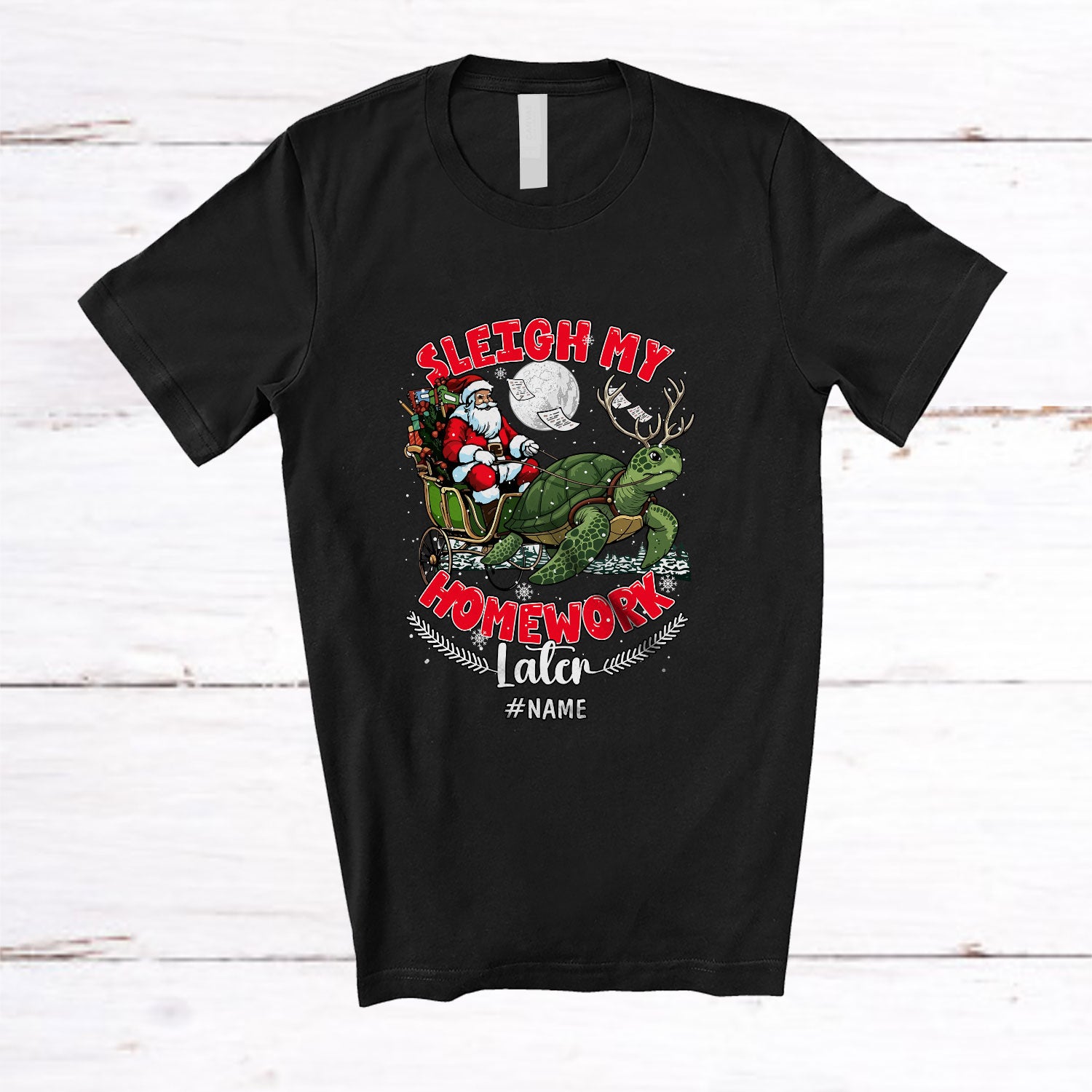 Personalized Custom Name Sleigh My Homework Later; Joyful Christmas Lazy Santa Sleigh Turtle T-Shirt. This cotton t-shirt is a durable staple product with a classic fit. One of the most popular items, it has a relaxed style made for everyday and casual wear.