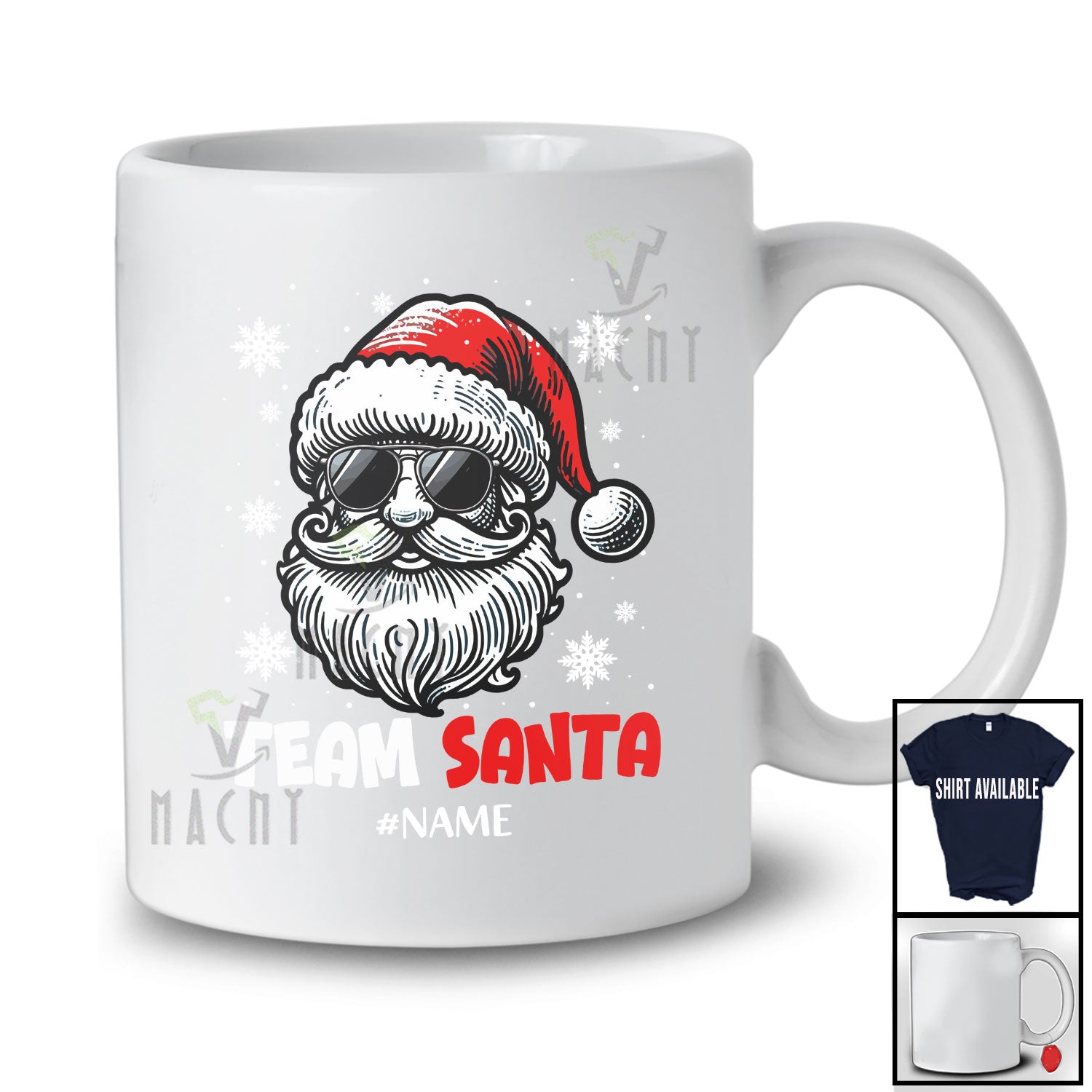 • Personalized Custom Name Team Santa; Amusing Christmas Santa Face Snow; Family Group T-Shirt. This cotton t-shirt is a durable staple product with a classic fit. One of the most popular items, it has a relaxed style made for everyday and casual wear.