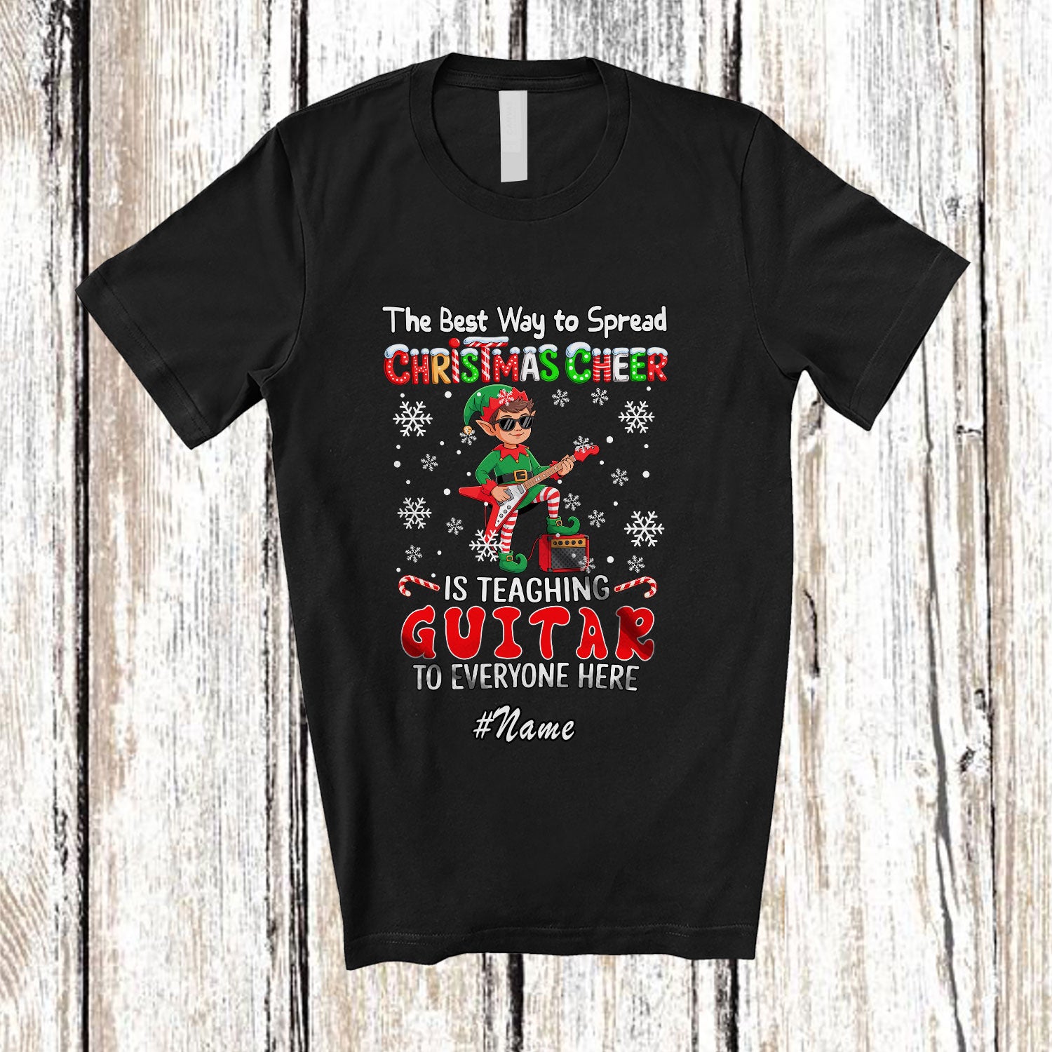 Personalized Custom Name Way Spread Christmas Cheer Teaching Guitar; Proud Teacher Elf T-Shirt. This cotton t-shirt is a durable staple product with a classic fit. One of the most popular items, it has a relaxed style made for everyday and casual wear.