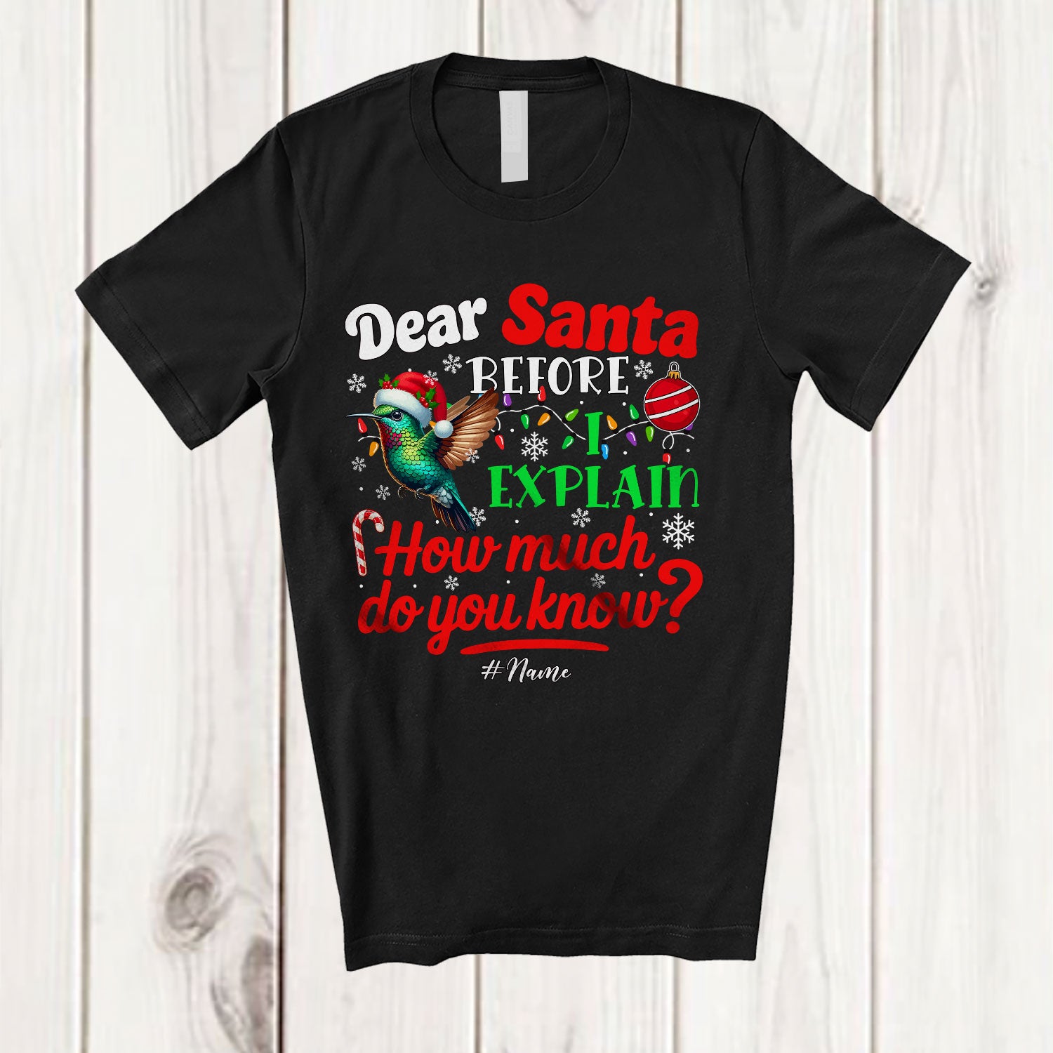 • Personalized Dear Santa How Much Do You Know; Lovely Christmas Custom Name Santa Hummingbird T-Shirt. This cotton t-shirt is a durable staple product with a classic fit. One of the most popular items, it has a relaxed style made for everyday and casual wear.