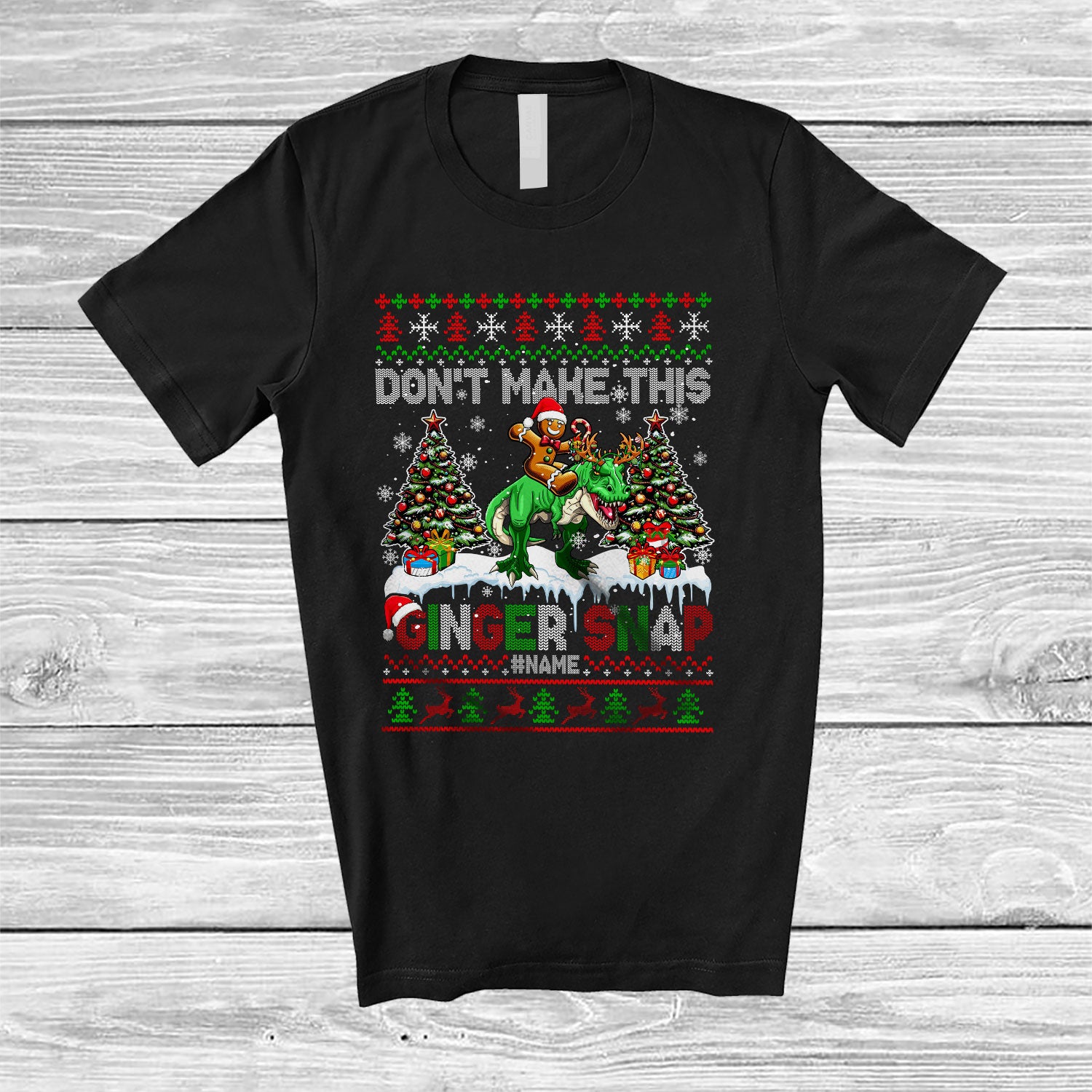 • Personalized Don't Make Ginger Snap; Joyful Christmas Custom Name Baker; Gingerbread Riding T-Rex T-Shirt. This cotton t-shirt is a durable staple product with a classic fit. One of the most popular items, it has a relaxed style made for everyday and casual wear.