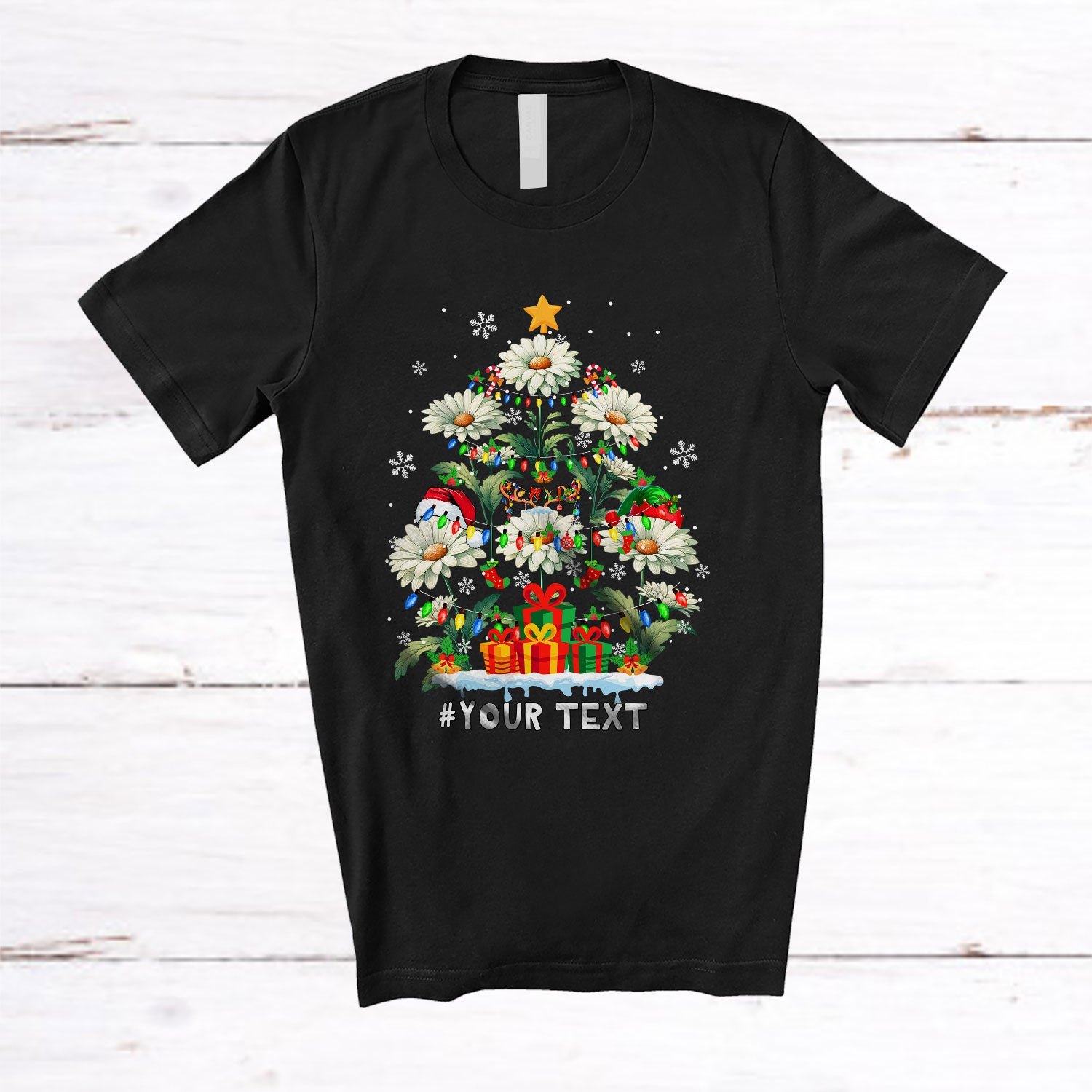 Personalized Elf Reindeer Santa Daisy Christmas Tree; Lovely Custom Name Family; Daisy Flower T-Shirt. This cotton t-shirt is a durable staple product with a classic fit. One of the most popular items, it has a relaxed style made for everyday and casual wear.
