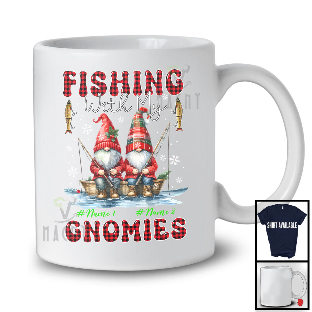 Personalized Fishing With My Gnomies; Lovely Christmas Plaid Custom Name Couple Gnomes T-Shirt