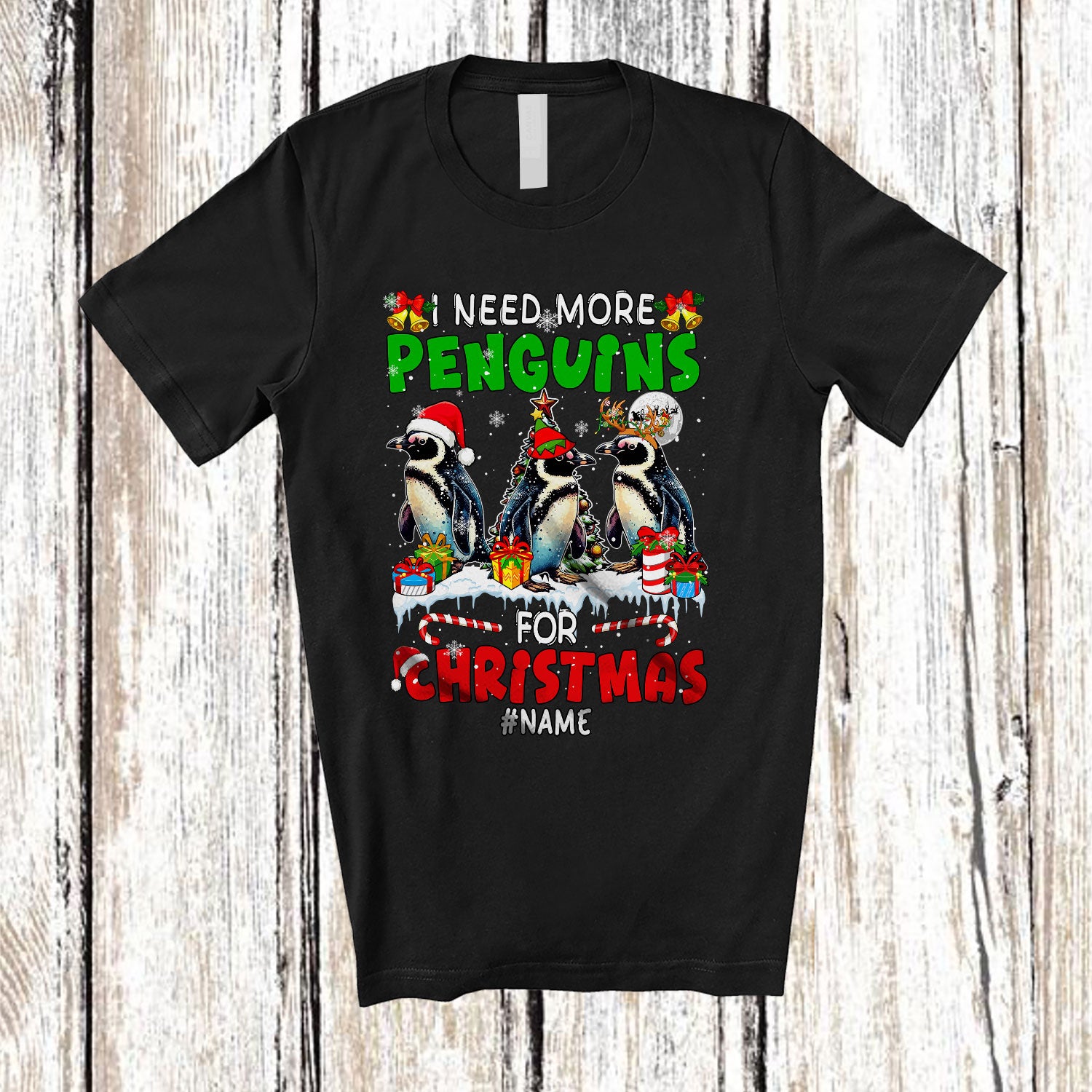 • Personalized I Need More Penguins For Christmas; Amusing X-mas Custom Name Animal; Family T-Shirt. This cotton t-shirt is a durable staple product with a classic fit. One of the most popular items, it has a relaxed style made for everyday and casual wear.
