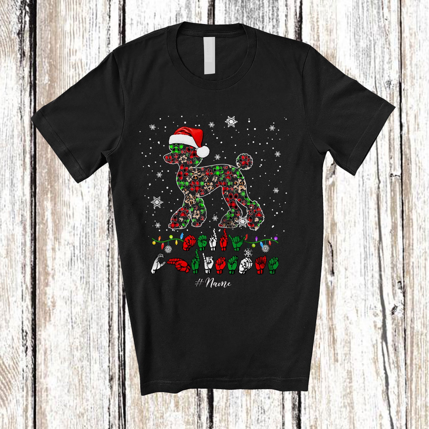 • Personalized Merry Christmas ASL; Lovely Custom Name Santa Poodle Paws Shape; Sign Language T-Shirt. This cotton t-shirt is a durable staple product with a classic fit. One of the most popular items, it has a relaxed style made for everyday and casual wear.