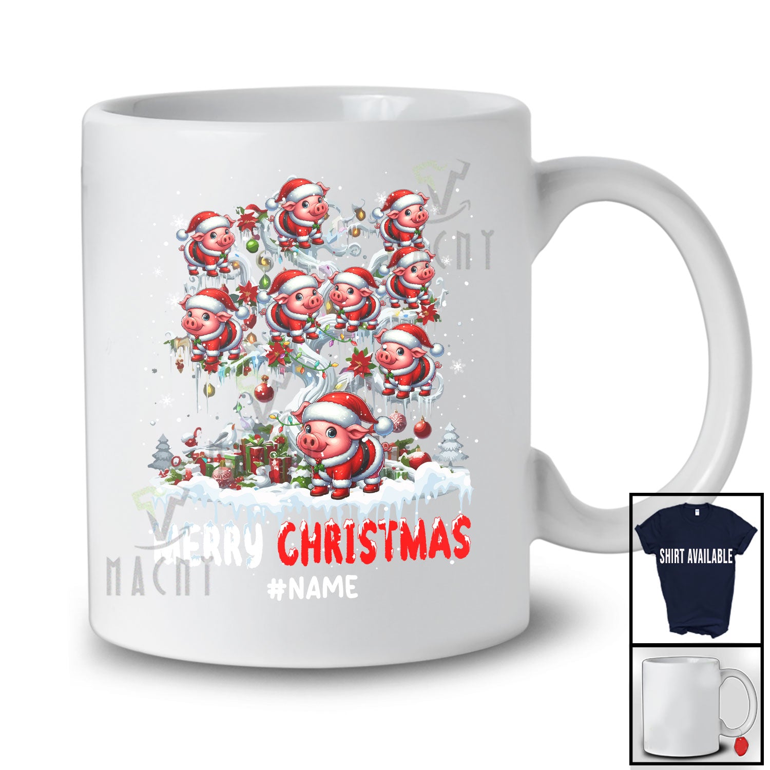 Personalized Merry Christmas; Lovely Santa Pig On X-mas Tree; Custom Name Farmer Family T-Shirt
