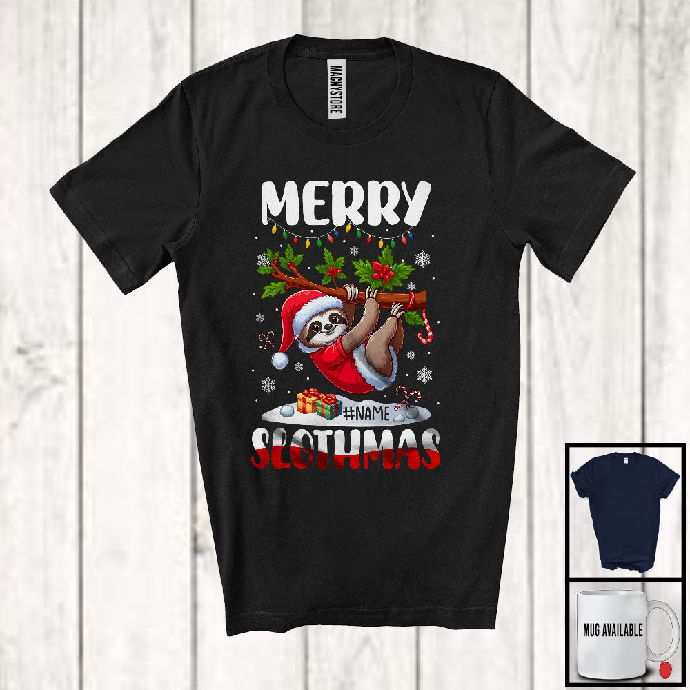 Personalized Merry Slothmas; Lovely Christmas Lights Custom Name Santa Sloth; Wild Animal T-Shirt
