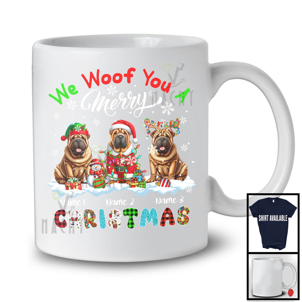 • Personalized We Woof You A Merry Christmas; Lovely Plaid Shar Peis Custom Name T-Shirt. This cotton t-shirt is a durable staple product with a classic fit. One of the most popular items, it has a relaxed style made for everyday and casual wear.