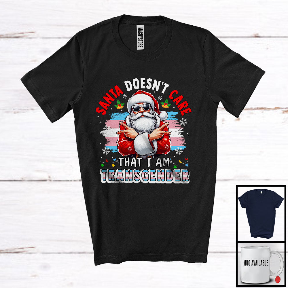 Santa Doesn't Care That I Am Transgender; Awesome Christmas LGBTQ Pride Santa Transgender Flag; Family T-Shirt. This cotton t-shirt is a durable staple product with a classic fit. One of the most popular items, it has a relaxed style made for everyday and casual wear.