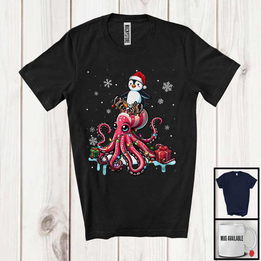 Santa Penguin Riding Reindeer Octopus; Adorable Christmas Lights Animal Lover; Snowing T-Shirt