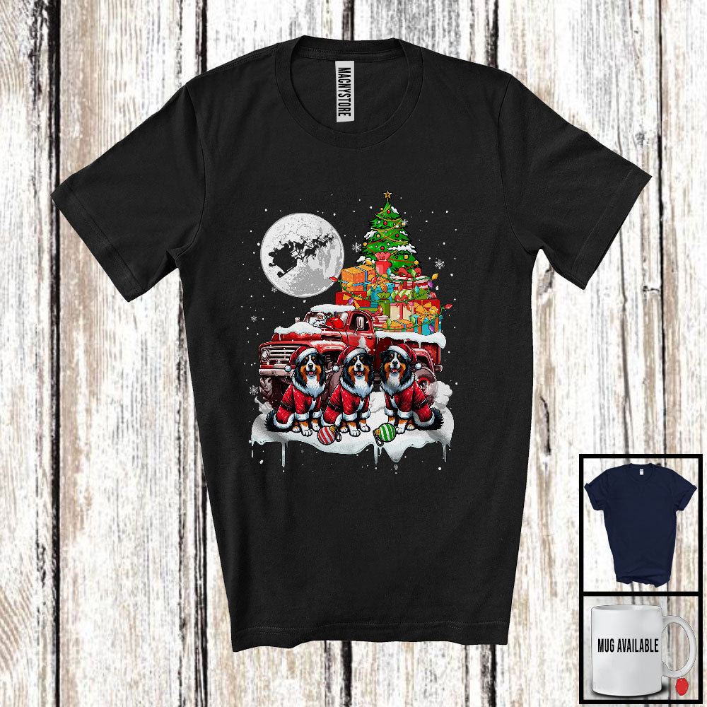 Three Santa Australian Shepherd; Fantastic Christmas Moon X-mas Tree On Pickup Truck Driver T-Shirt