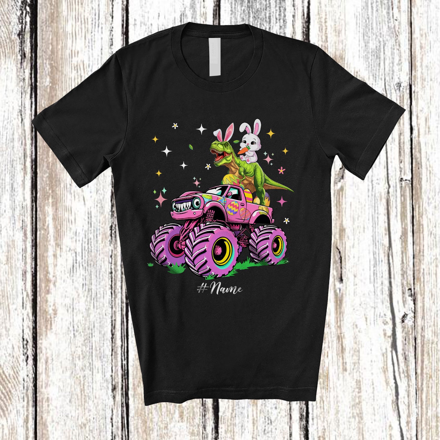 • Personalized Bunny T-Rex On Monster Truck Dino; Adorable Easter Custom Name Dinosaur; Egg Hunt T-Shirt. This cotton t-shirt is a durable staple product with a classic fit. One of the most popular items, it has a relaxed style made for everyday and casual wear.