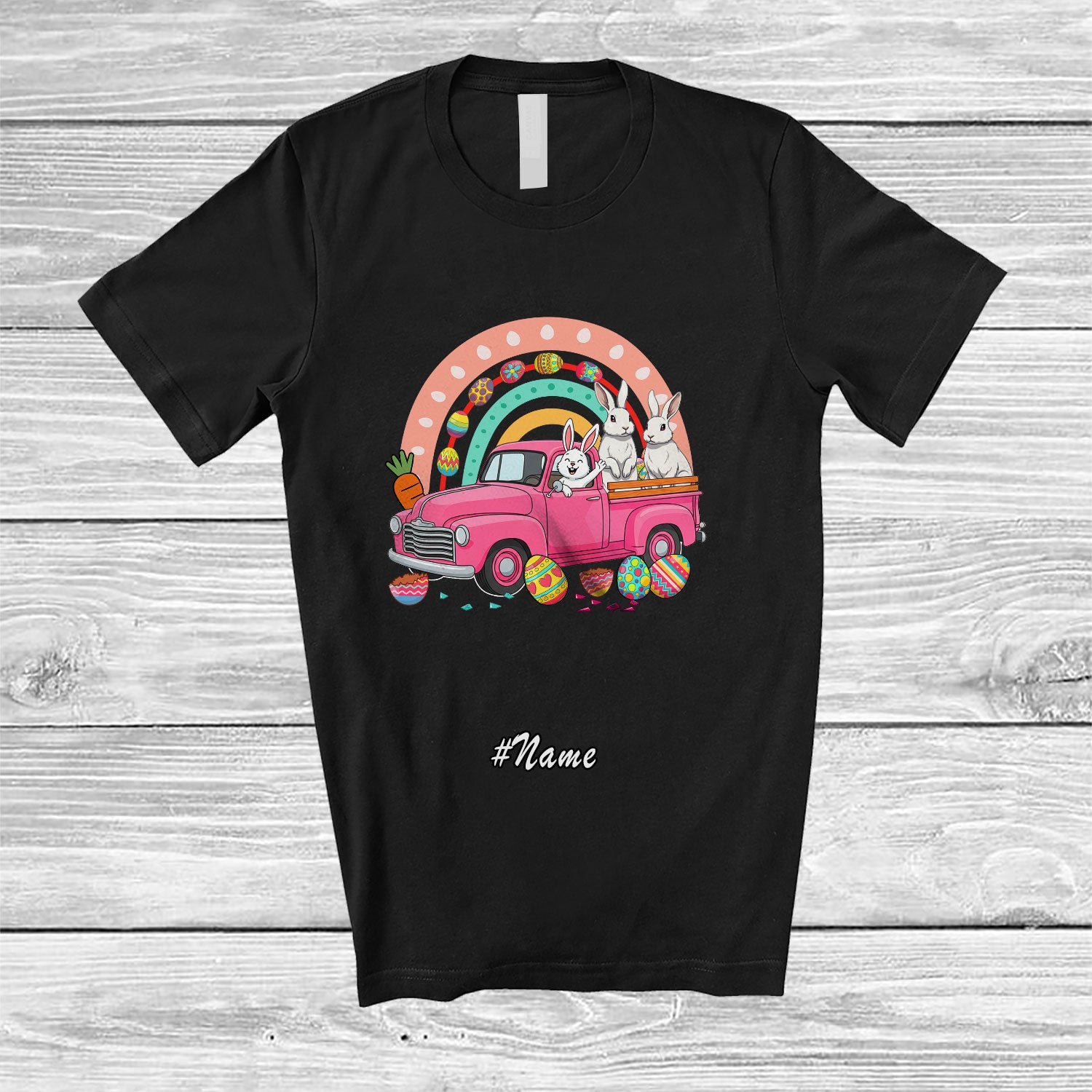 Personalized Custom Name Bunny Rabbits Couple On Truck; Lovely Easter Wild Animal Rainbow T-Shirt. This cotton t-shirt is a durable staple product with a classic fit. One of the most popular items, it has a relaxed style made for everyday and casual wear.