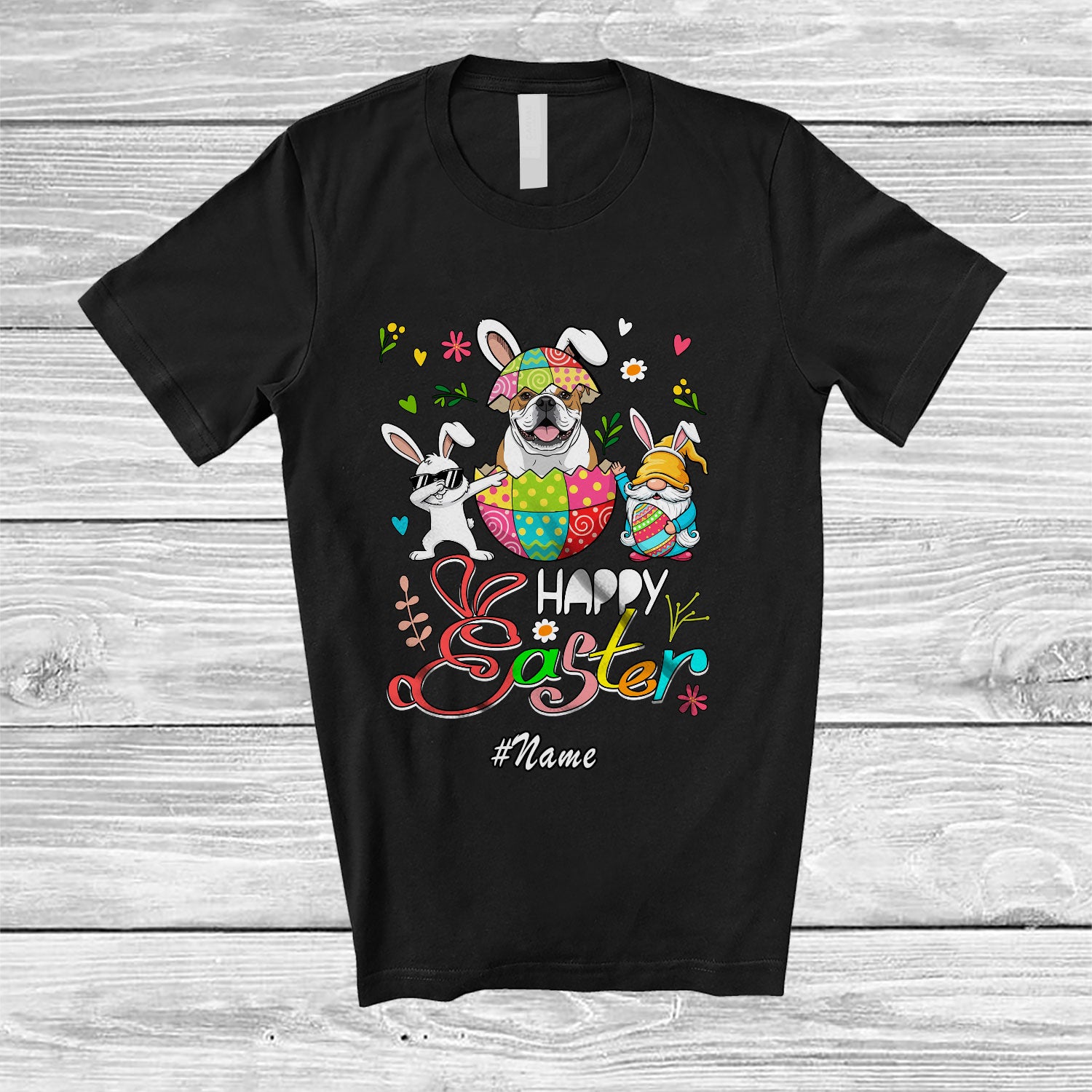 Personalized Custom Name Happy Easter; Joyful Dabbing Bunny Bulldog; Easter Eggs Gnome T-Shirt. This cotton t-shirt is a durable staple product with a classic fit. One of the most popular items, it has a relaxed style made for everyday and casual wear.
