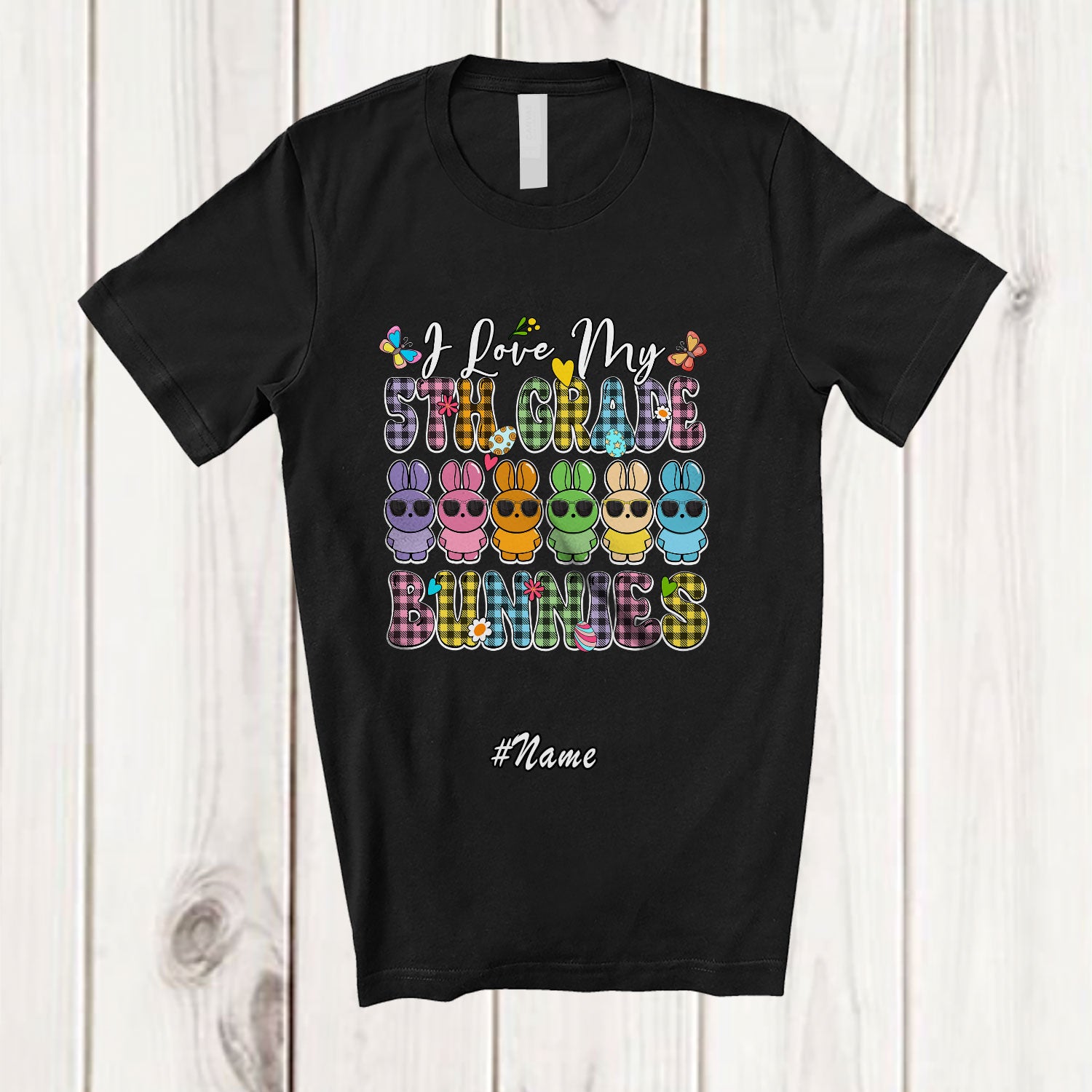 • Personalized Custom Name I Love My 5th Grade Bunnies; Lovely Easter Plaid Bunny Sunglasses Teacher T-Shirt. This cotton t-shirt is a durable staple product with a classic fit. One of the most popular items, it has a relaxed style made for everyday and casual wear.