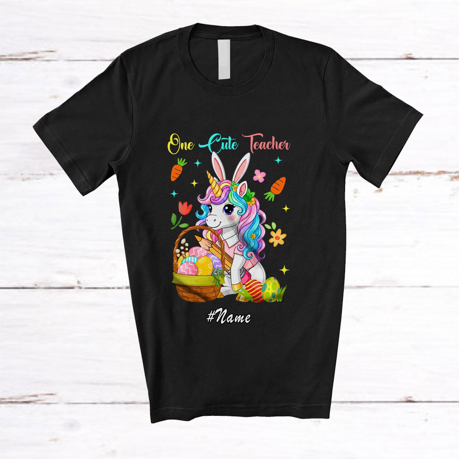 • Personalized Custom Name One Cute Teacher; Adorable Easter Unicorn With Eggs Basket; Eggs Hunting T-Shirt. This cotton t-shirt is a durable staple product with a classic fit. One of the most popular items, it has a relaxed style made for everyday and casual wear.