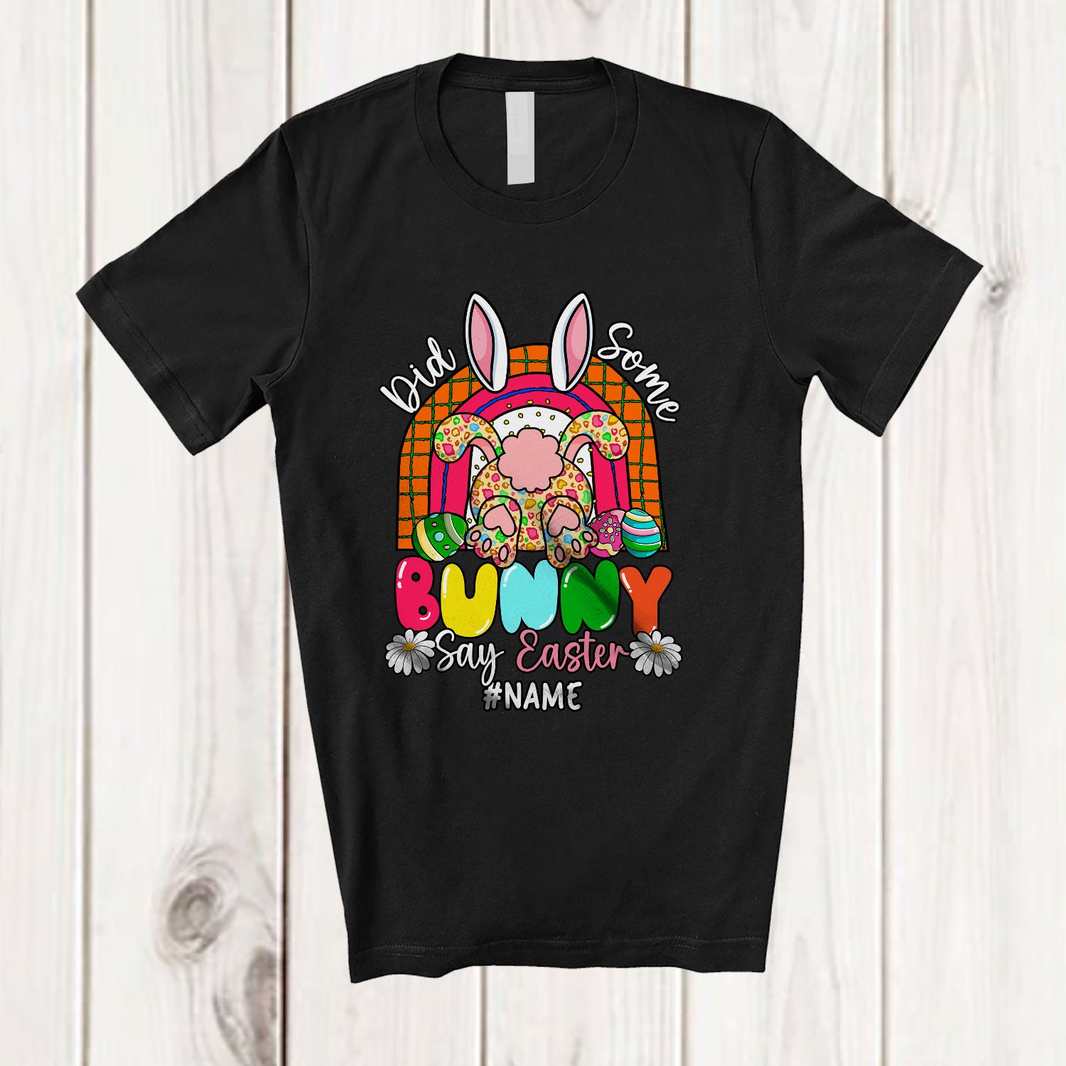 Personalized Did Some Bunny Say Easter; Adorable Custom Name Leopard Bunny From Back; Rainbow T-Shirt. This cotton t-shirt is a durable staple product with a classic fit. One of the most popular items, it has a relaxed style made for everyday and casual wear.