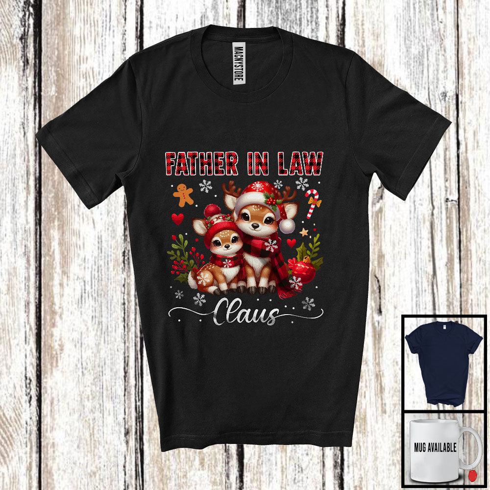 Father in law Claus; Lovely Christmas Red Plaid Reindeer Lover; X-mas Snowing Family Group T-Shirt. This cotton t-shirt is a durable staple product with a classic fit. One of the most popular items, it has a relaxed style made for everyday and casual wear.