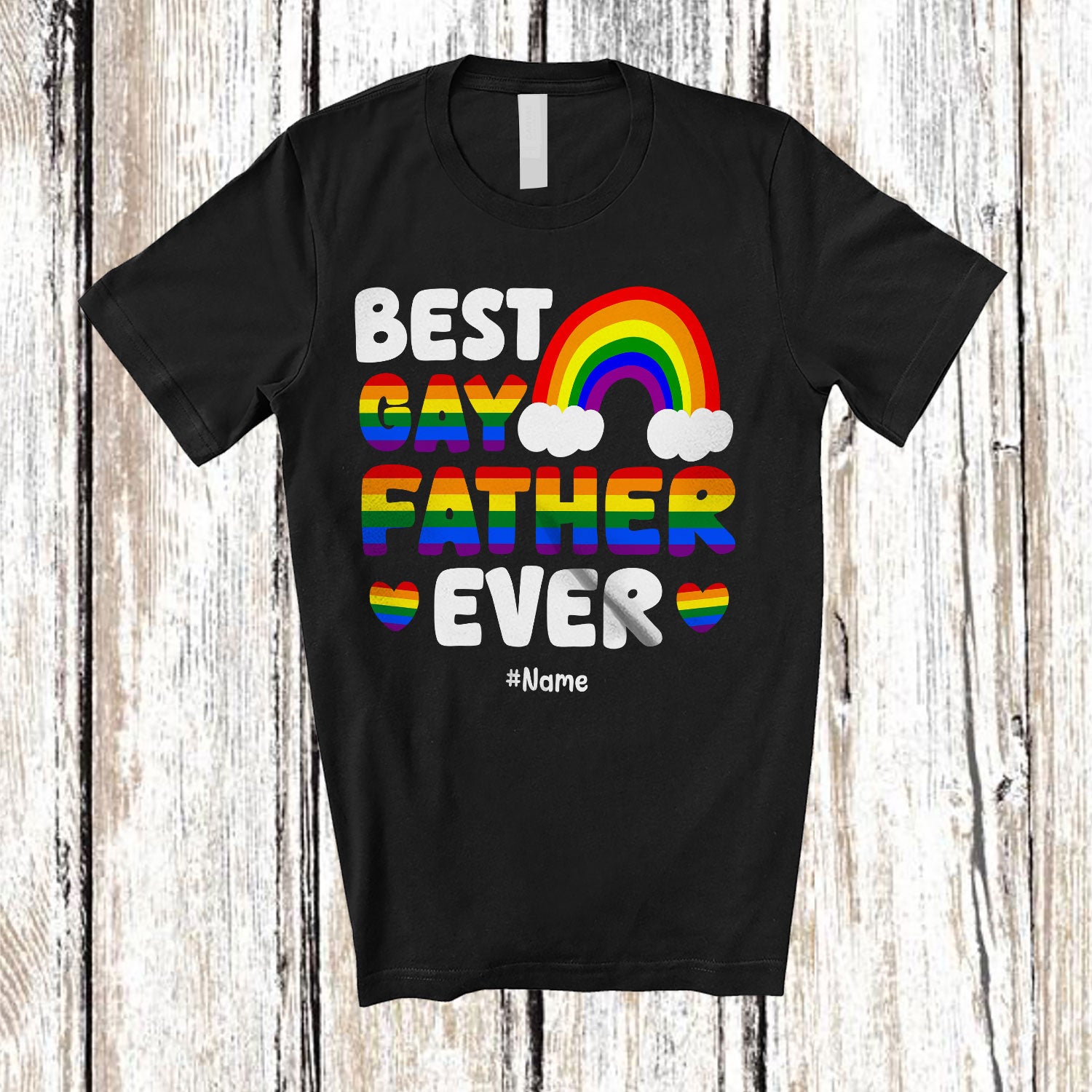 Personalized Best Gay Father Ever; Joyful LGBTQ Pride Custom Name Gay Rainbow Heart Family T-Shirt. This cotton t-shirt is a durable staple product with a classic fit. One of the most popular items, it has a relaxed style made for everyday and casual wear.