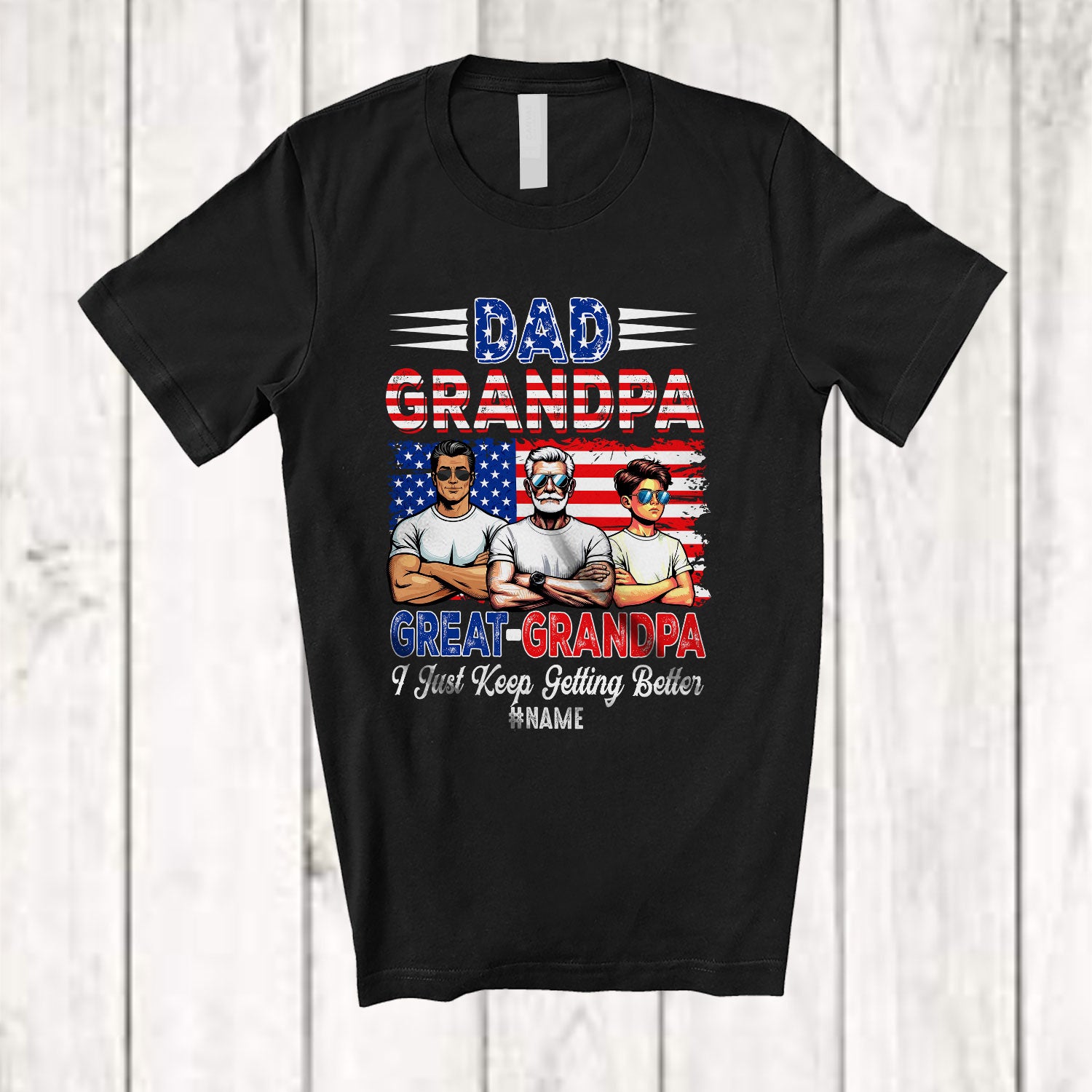 • Personalized Custom Name Dad Grandpa Great Grandpa Getting Better; Proud Father's Day Son Family T-Shirt. This cotton t-shirt is a durable staple product with a classic fit. One of the most popular items, it has a relaxed style made for everyday and casual wear.