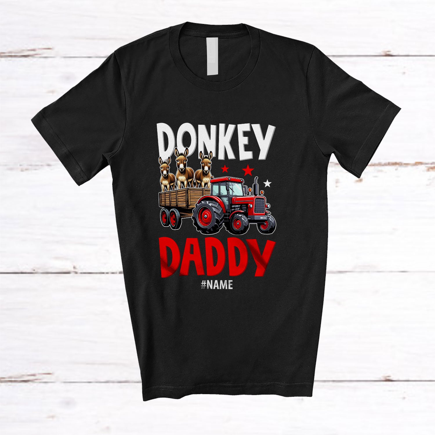 • Personalized Custom Name Donkey Dad; Lovely Father's Day Donkey On Trailer Tractor; Farmer T-Shirt. This cotton t-shirt is a durable staple product with a classic fit. One of the most popular items, it has a relaxed style made for everyday and casual wear.