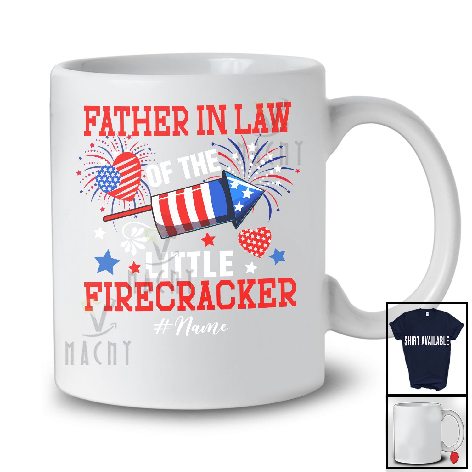 Personalized Custom Name Father in law Of The Little Firecracker; Lovely 4th Of July Family Patriotic T-Shirt. This cotton t-shirt is a durable staple product with a classic fit. One of the most popular items, it has a relaxed style made for everyday and casual wear.