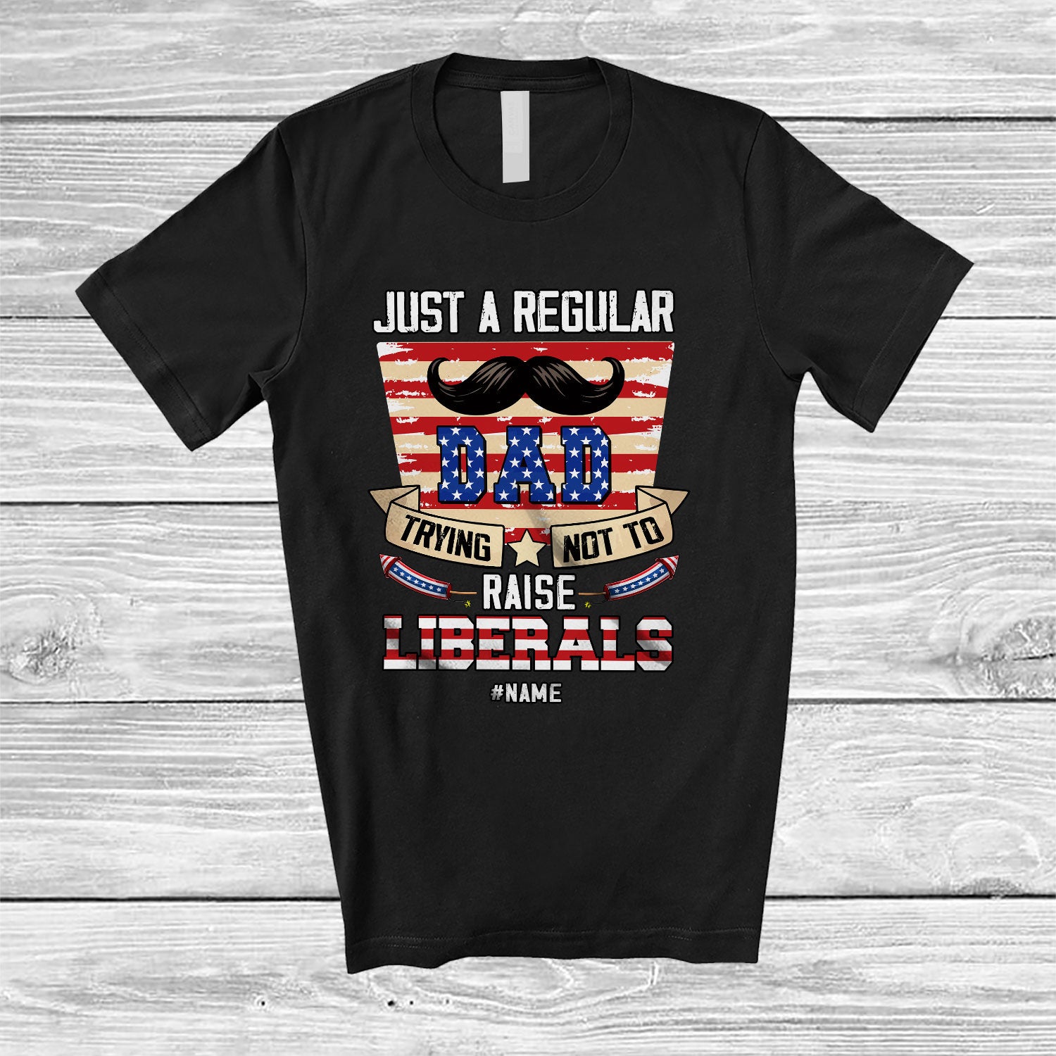 • Personalized Custom Name Regular Dad Trying Not to Raise Liberals; Amusing Father's Day Mustache Family T-Shirt. This cotton t-shirt is a durable staple product with a classic fit. One of the most popular items, it has a relaxed style made for everyday and casual wear.