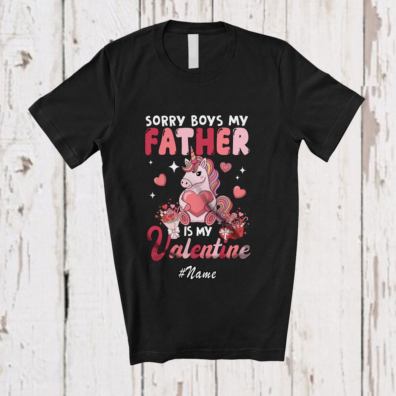 Personalized Custom Name Sorry My Father Is My Valentine; Lovely Unicorn Hearts; Girls Family T-Shirt. This cotton t-shirt is a durable staple product with a classic fit. One of the most popular items, it has a relaxed style made for everyday and casual wear.