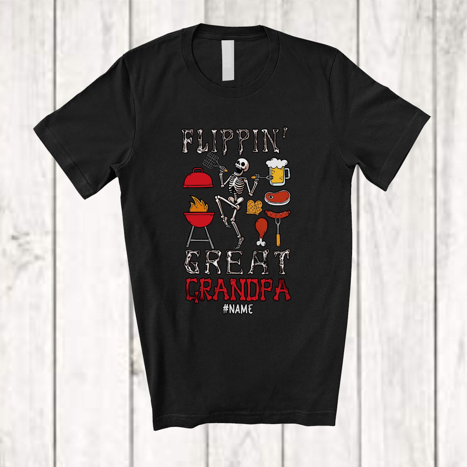 • Personalized Flippin' Great Grandpa; Humorous Father's Day BBQ Grill; Custom Name Family T-Shirt. This cotton t-shirt is a durable staple product with a classic fit. One of the most popular items, it has a relaxed style made for everyday and casual wear.