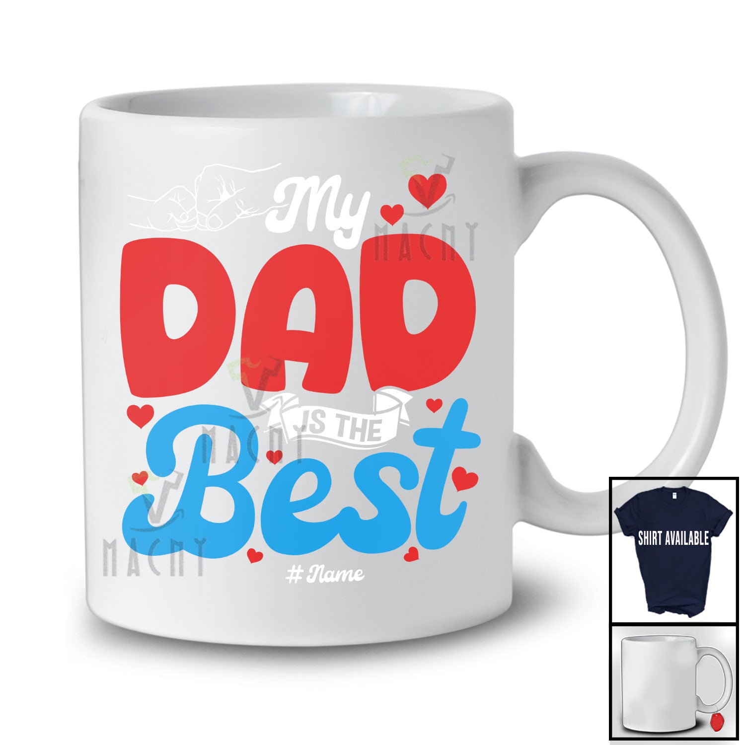 Personalized My Dad Is The Best; Amusing Father's Day Hearts Hands; Custom Name Family T-Shirt. This cotton t-shirt is a durable staple product with a classic fit. One of the most popular items, it has a relaxed style made for everyday and casual wear.