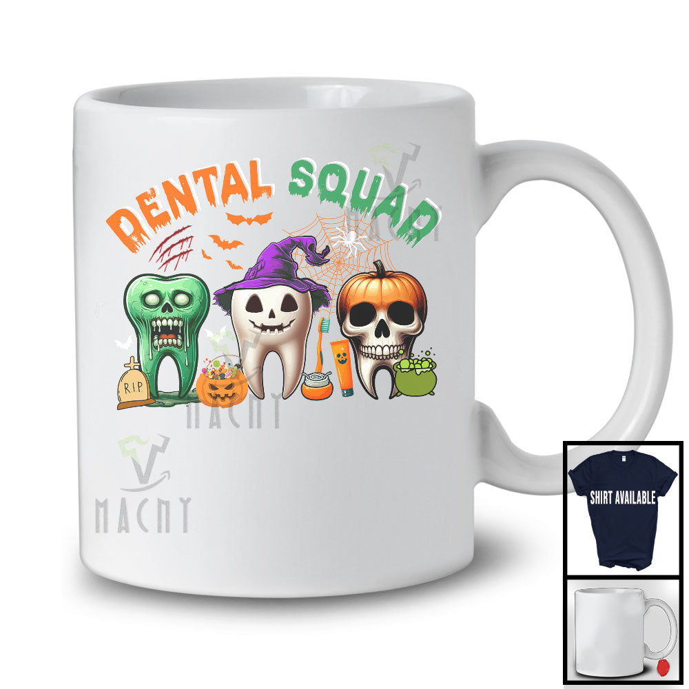 Dental Squad; Adorable Halloween Witch Zombie Pumpkin Teeth Tooth; Dental Assistant Dentist Group T-Shirt. This cotton t-shirt is a durable staple product with a classic fit. One of the most popular items, it has a relaxed style made for everyday and casual wear.