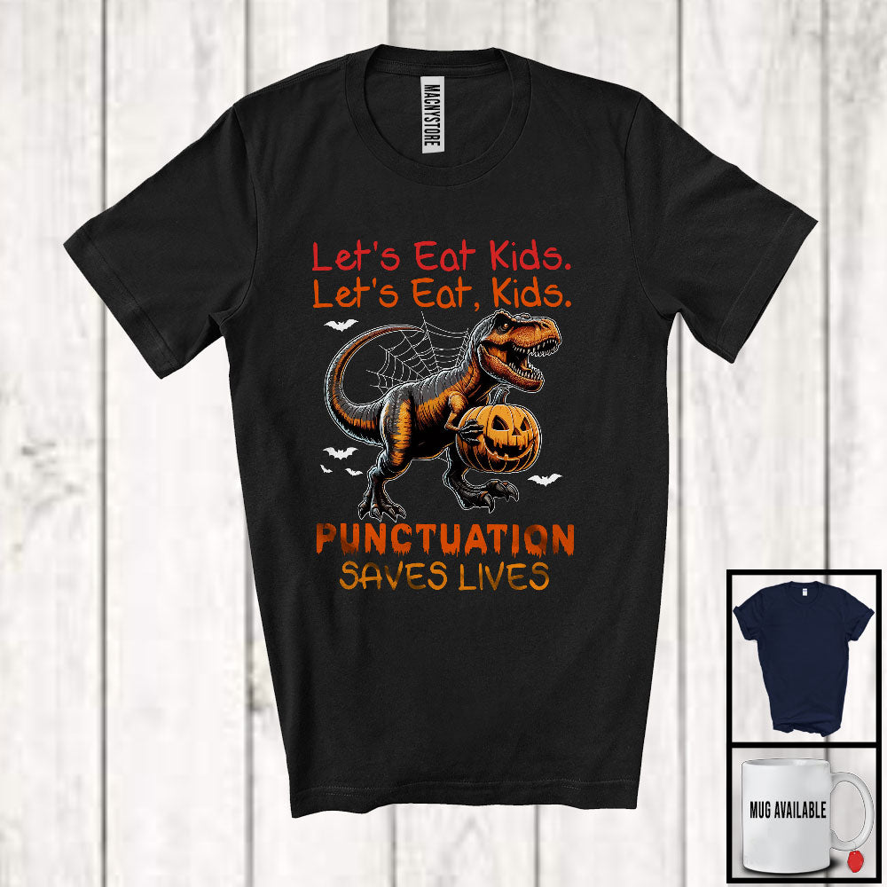 Let's Eat Kids Punctuation Saves Lives; Awesome Halloween T-Rex Pumpkin; Grammar Teacher T-Shirt
