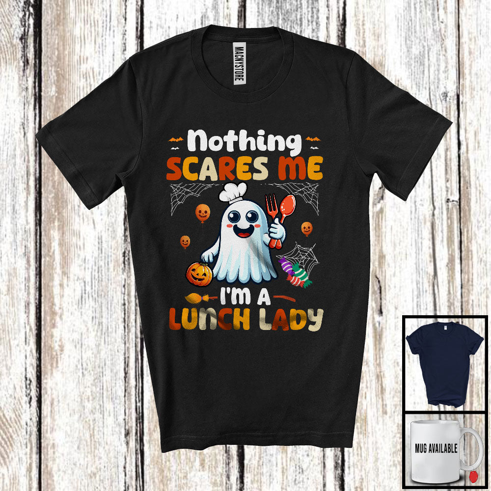Nothing Scares Me I'm A Lunch Lady; Adorable Halloween Costume Boo Ghost; Family Group T-Shirt. This cotton t-shirt is a durable staple product with a classic fit. One of the most popular items, it has a relaxed style made for everyday and casual wear.