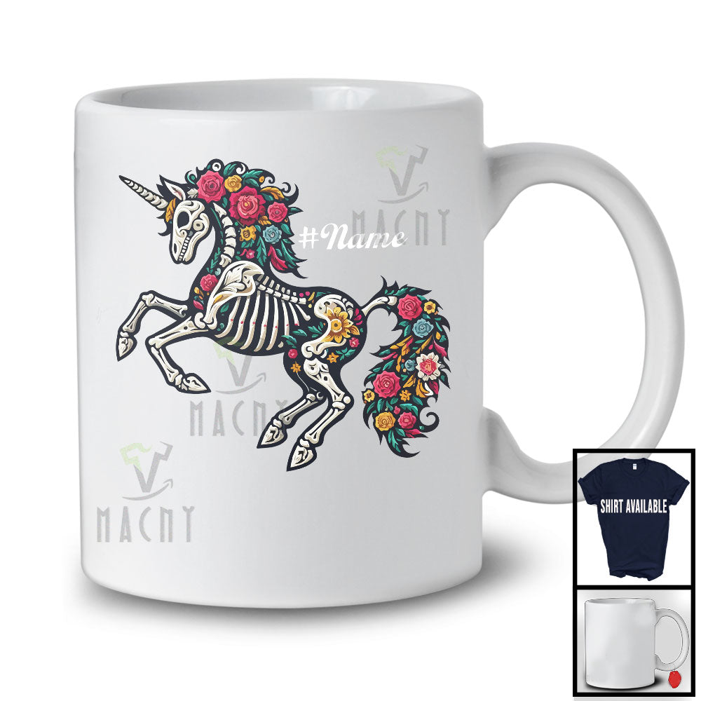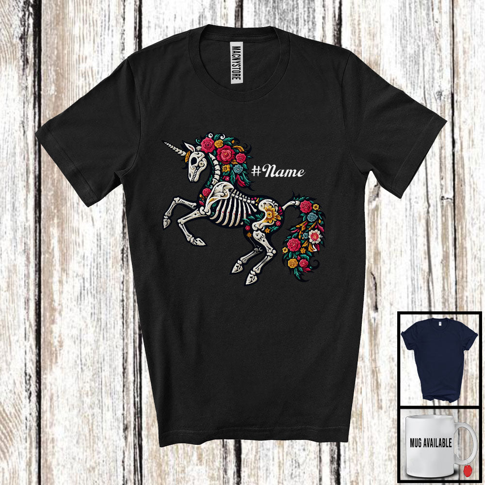 Personalized Custom Name Floral Skulls Unicorn; Lovely Halloween Dia De Los Muertos Mexican T-Shirt
