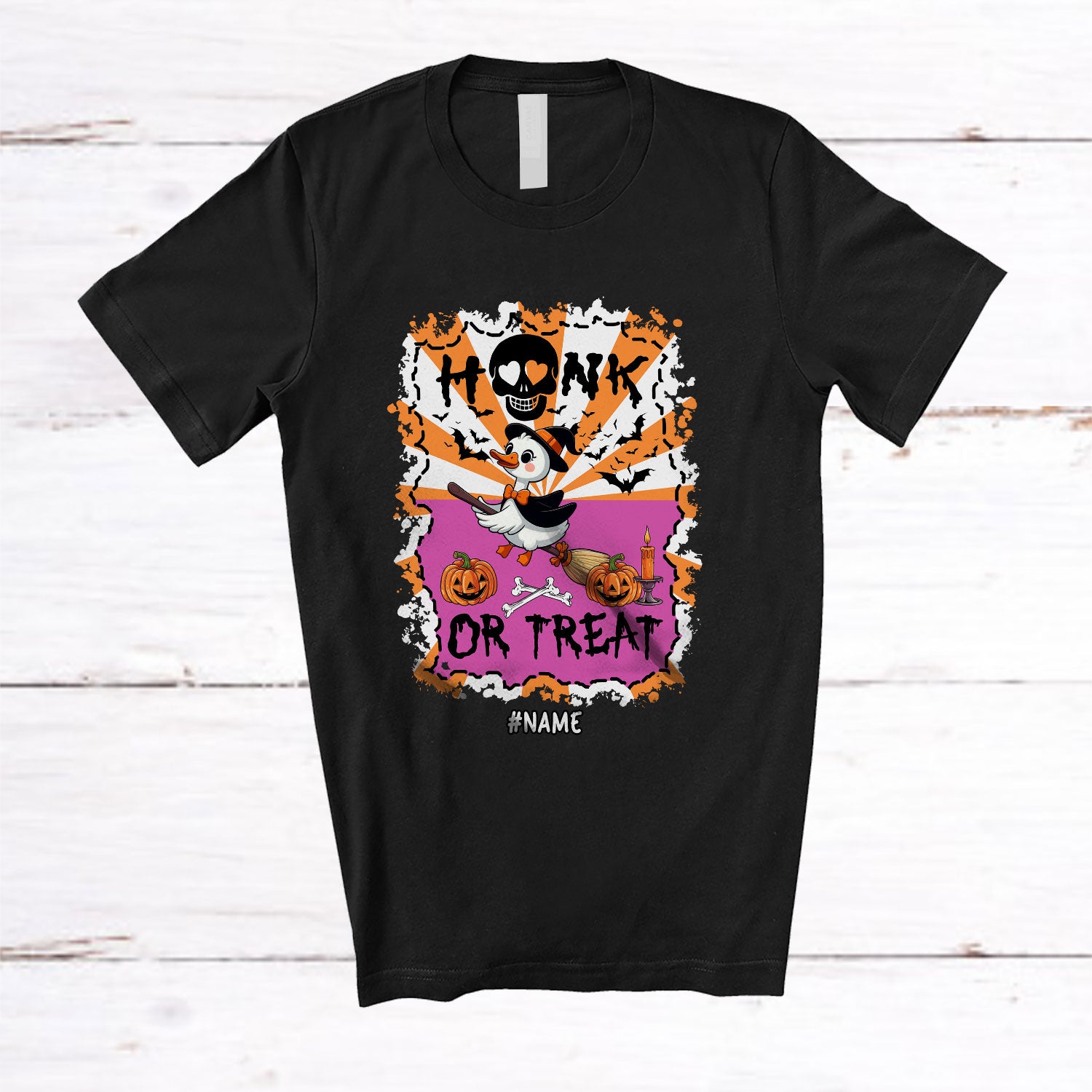 Personalized Custom Name Honk Or Treat; Joyful Halloween Witch Goose Riding Broom; Farmer T-Shirt. This cotton t-shirt is a durable staple product with a classic fit. One of the most popular items, it has a relaxed style made for everyday and casual wear.