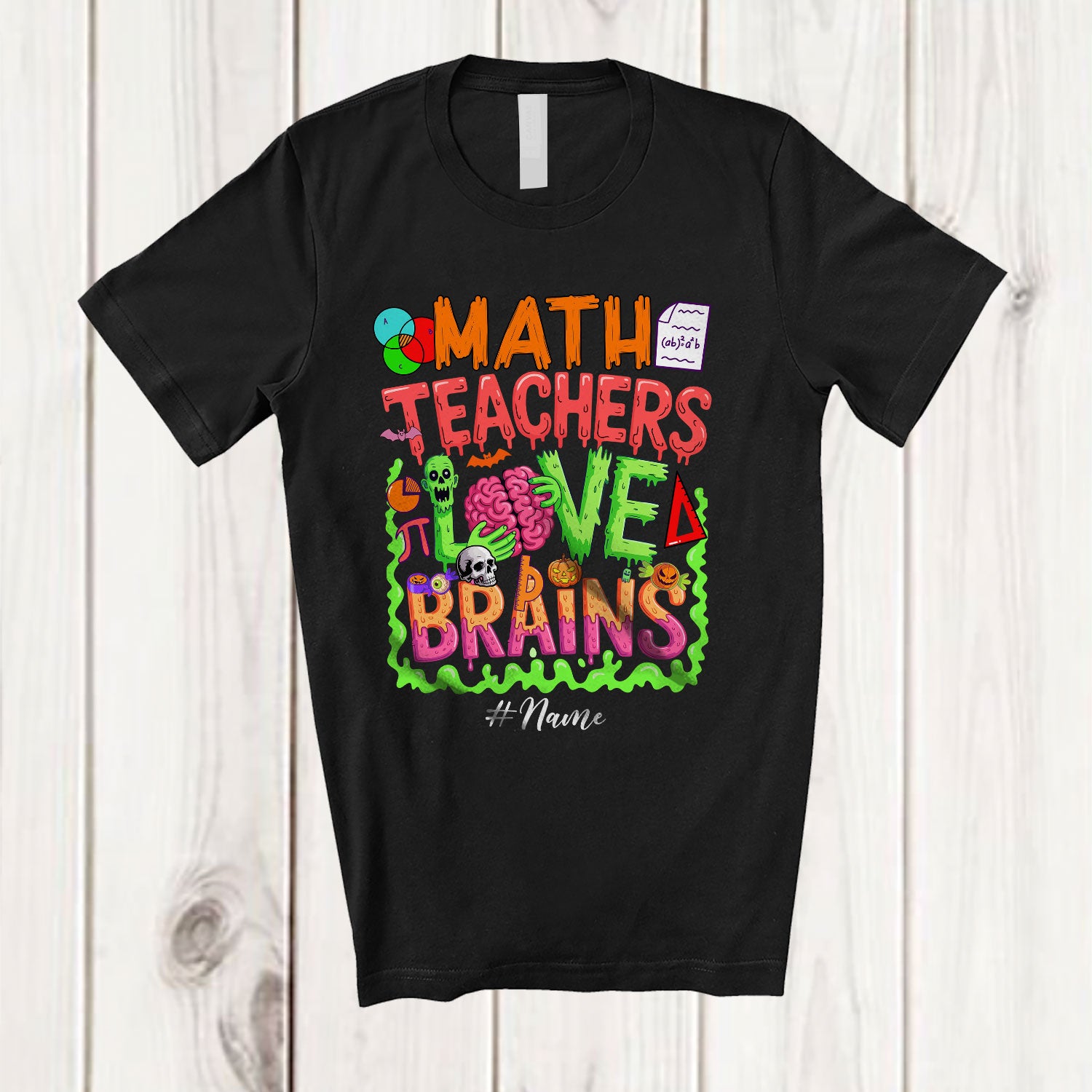 Personalized Custom Name Math Teachers Love Brains; Scary Halloween Zombies Teacher T-Shirt. This cotton t-shirt is a durable staple product with a classic fit. One of the most popular items, it has a relaxed style made for everyday and casual wear.