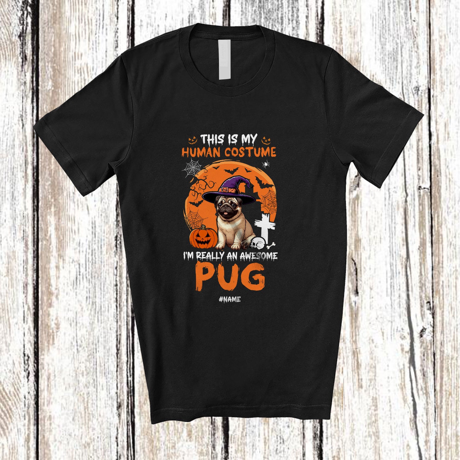 Personalized Custom Name My Human Costume Pug; Creepy Halloween Moon Animal Witch T-Shirt. This cotton t-shirt is a durable staple product with a classic fit. One of the most popular items, it has a relaxed style made for everyday and casual wear.