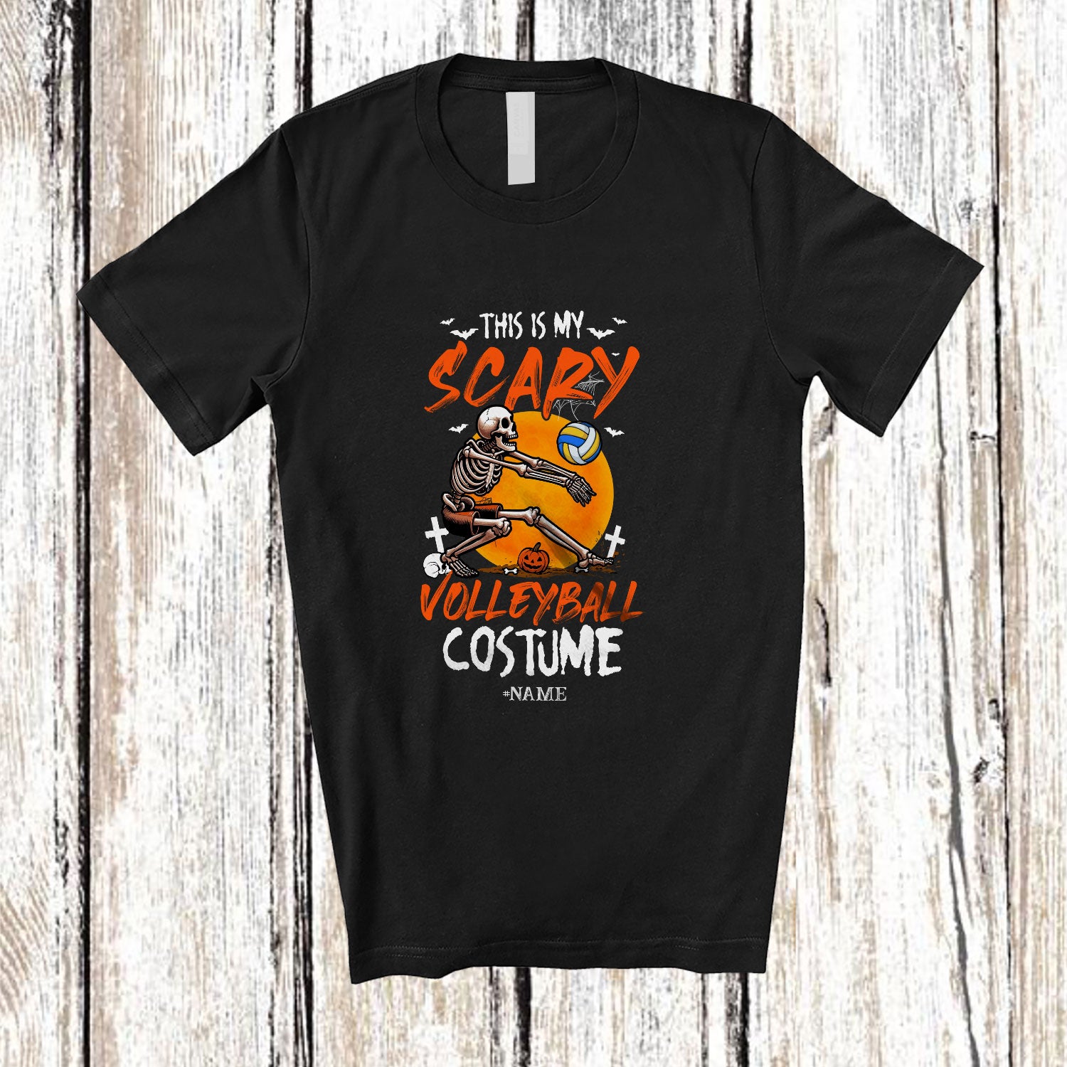 • Personalized Custom Name My Scary Volleyball Costume; Creepy Halloween Skeleton Playing Sport Player T-Shirt. This cotton t-shirt is a durable staple product with a classic fit. One of the most popular items, it has a relaxed style made for everyday and casual wear.