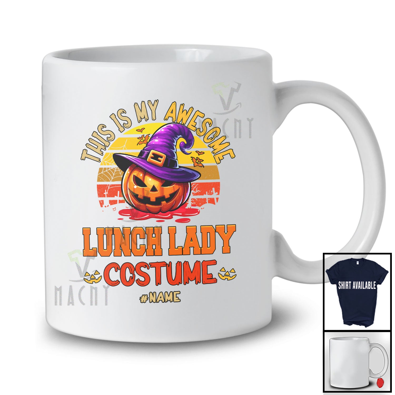 Personalized Custom Name Retro My Awesome Lunch Lady Costume; Scary Halloween Pumpkin T-Shirt. This cotton t-shirt is a durable staple product with a classic fit. One of the most popular items, it has a relaxed style made for everyday and casual wear.