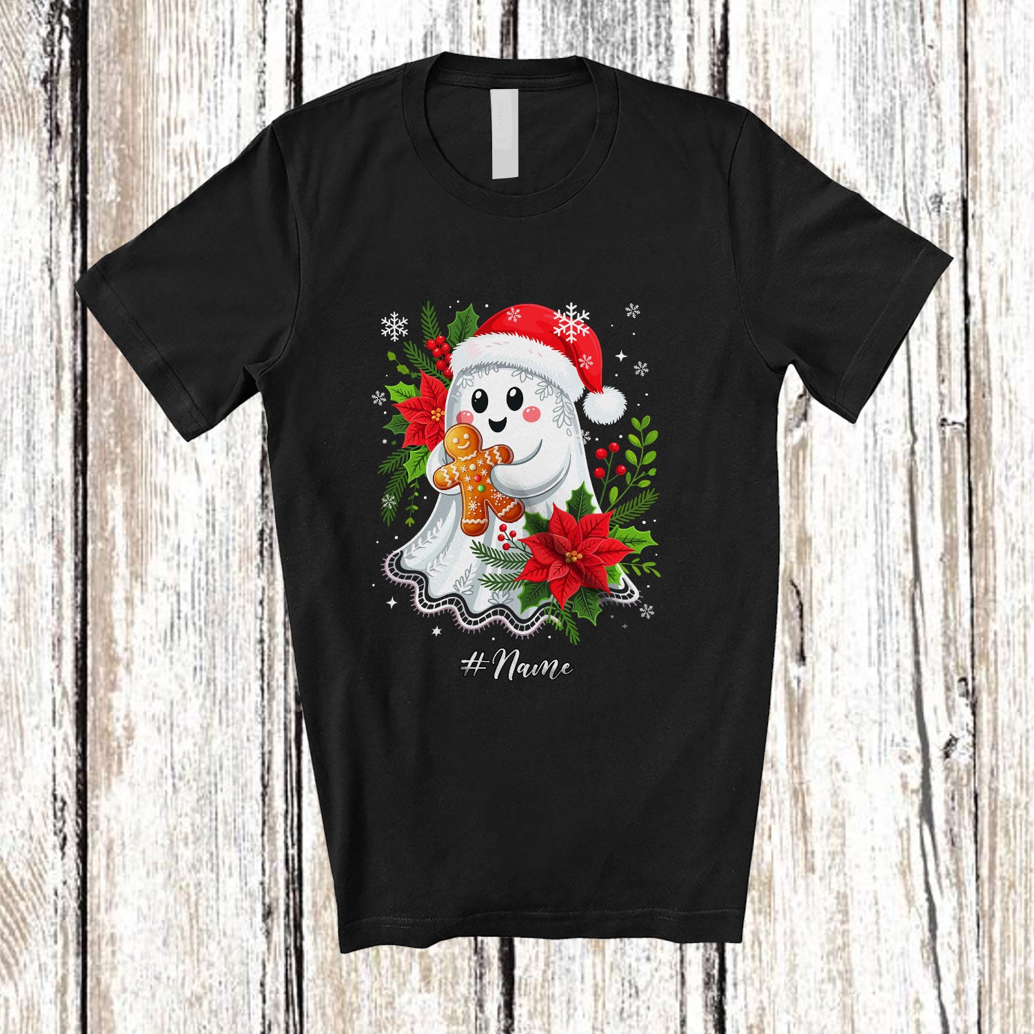 • Personalized Custom Name Santa Ghost Boo With Gingerbread; Lovely Halloween Christmas Baking Baker T-Shirt. This cotton t-shirt is a durable staple product with a classic fit. One of the most popular items, it has a relaxed style made for everyday and casual wear.