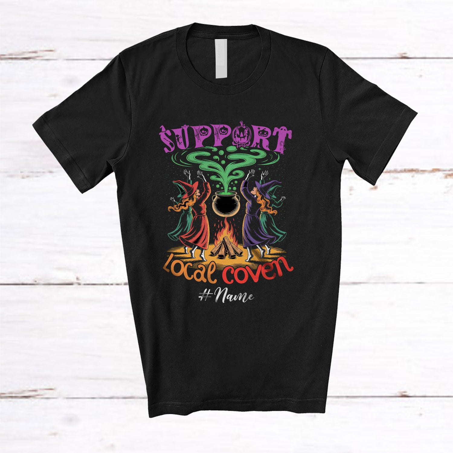 Personalized Custom Name Support Local Coven; Sarcastic Halloween Witch Camping Fire T-Shirt